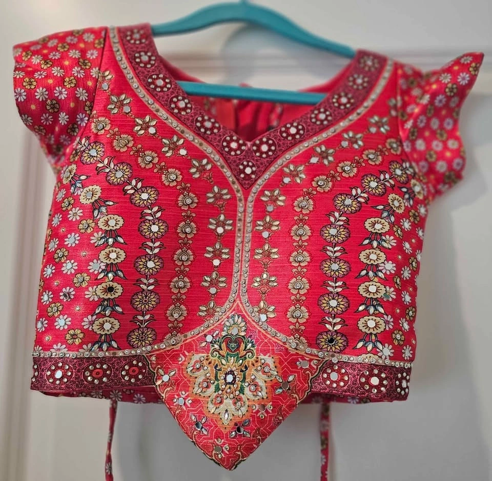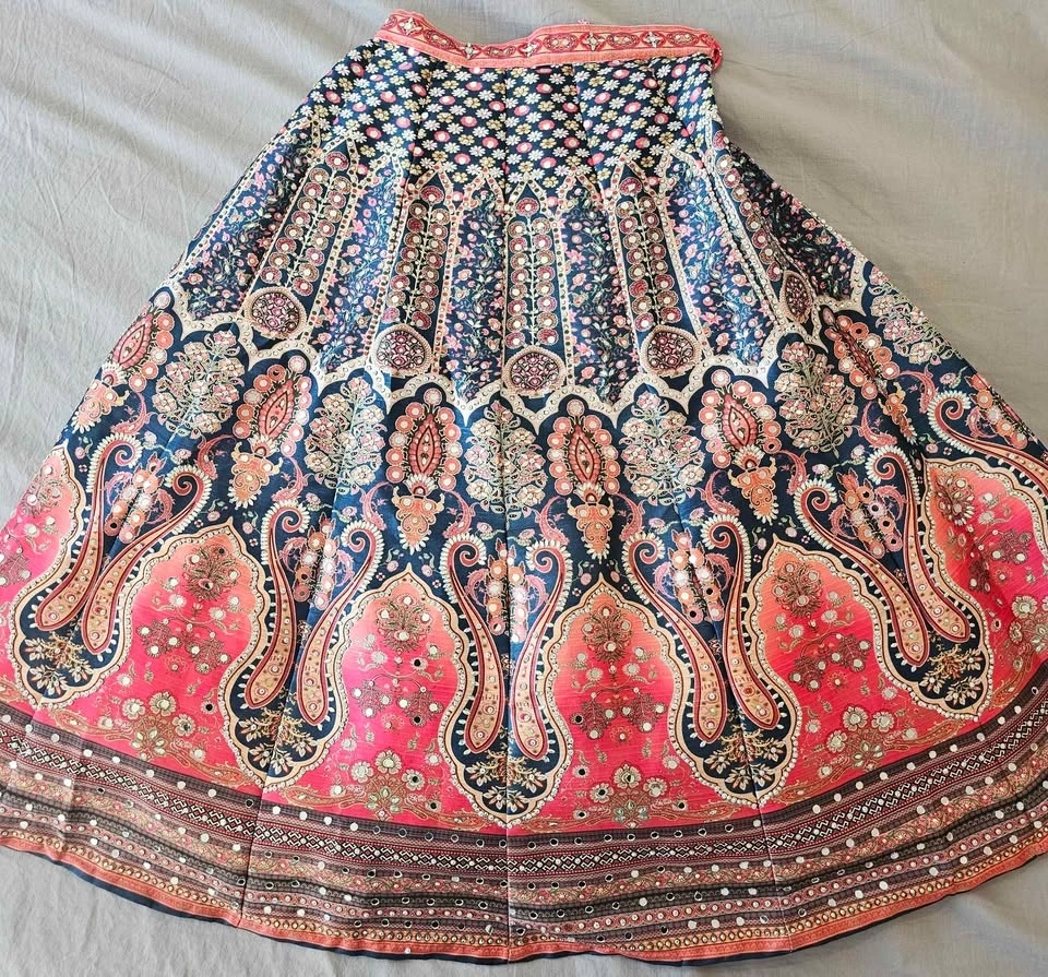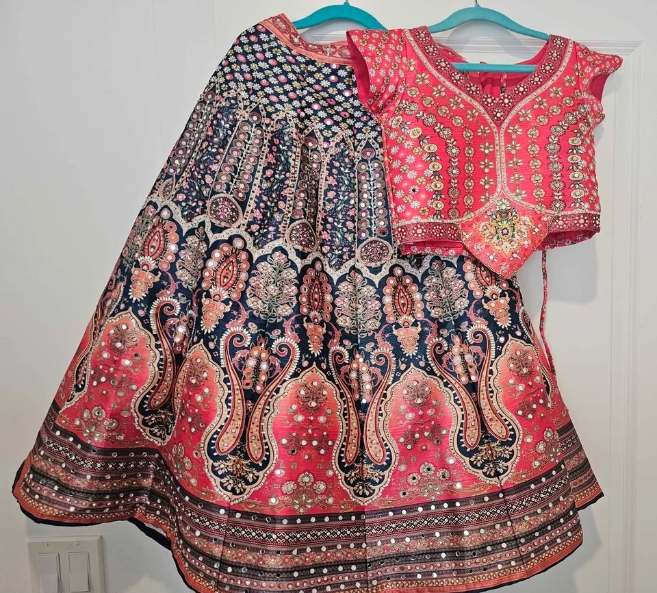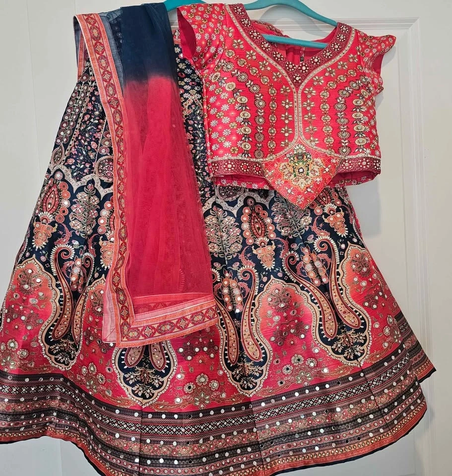 Vibrant lehenga choli set with matching dupatta. Skirt has beautiful coral and navy blue paisley patterns. Blouse has intricate mirror work and embroidery. Complete traditional outfit.