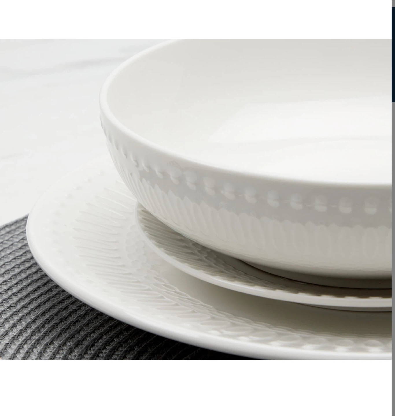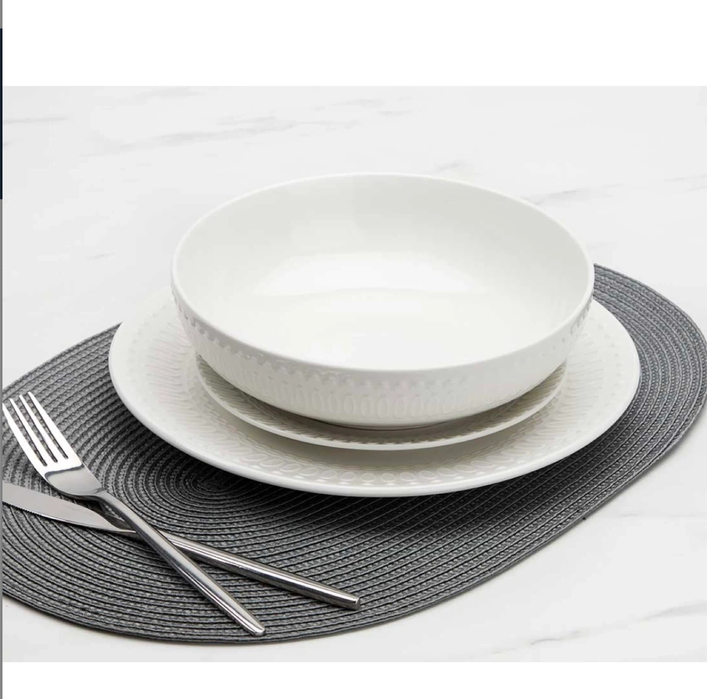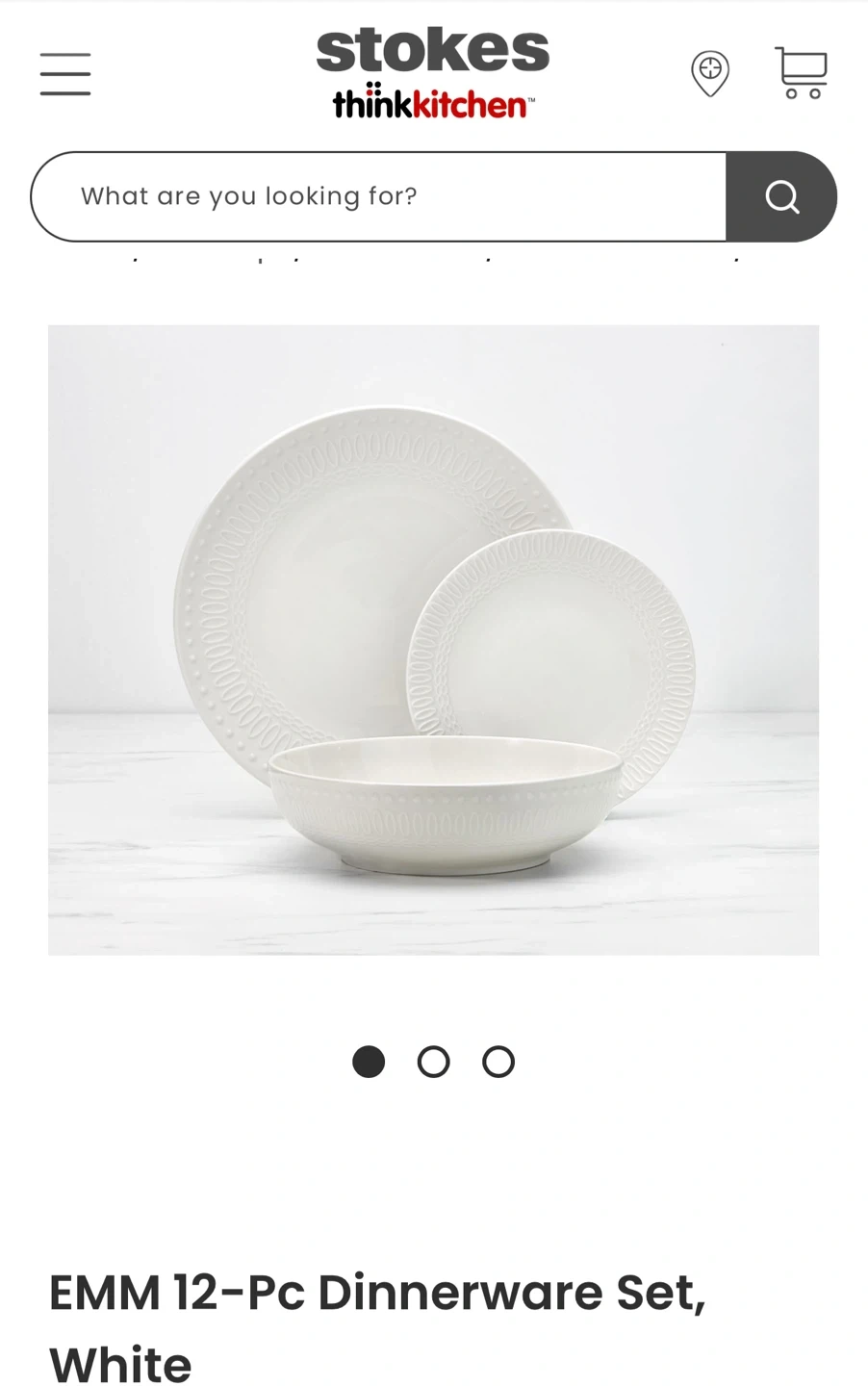 This Stokes EMM dinnerware set comes in white. It's a 12-piece set. The stoneware material is durable. There are 12 place settings. One bowl is broken. Asking for $100.00 obo.