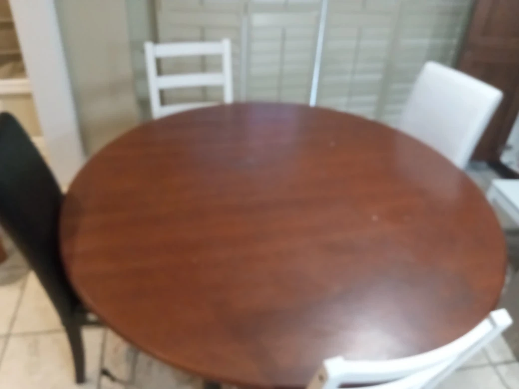 A round wooden dining table with a warm, dark wood finish. Its classic design seats four comfortably. Great for smaller dining spaces! 4 chairs 70 cm high