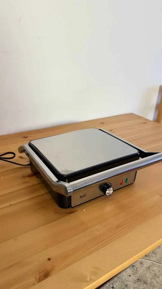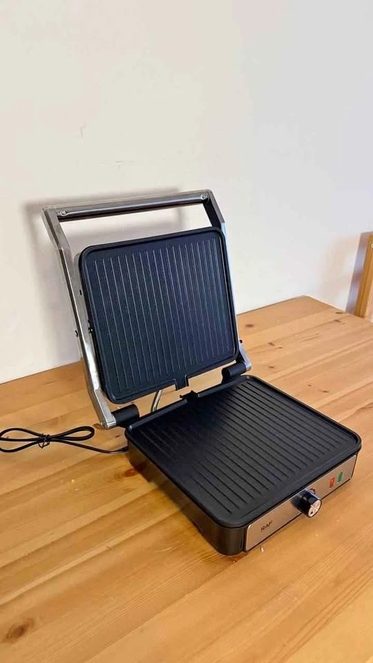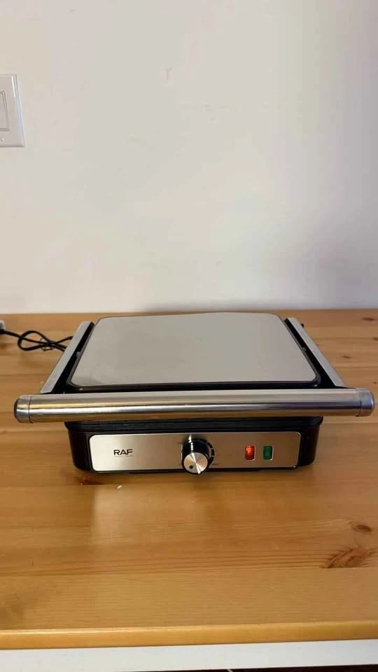 Brand new. 1200W power for fast and even cooking. Non-stick removable plates for easy cleaning. Opens 180 degrees for versatile grilling. Adjustable temperature control for perfect results. Ideal for sandwiches, paninis, and grilling at home.