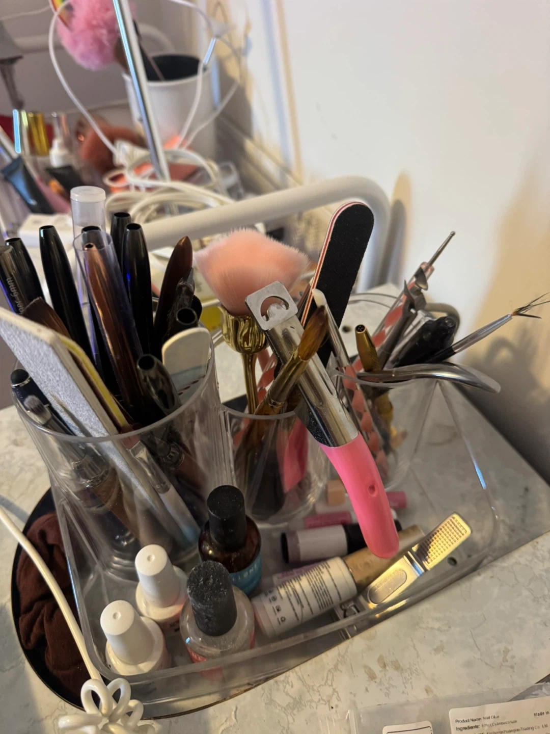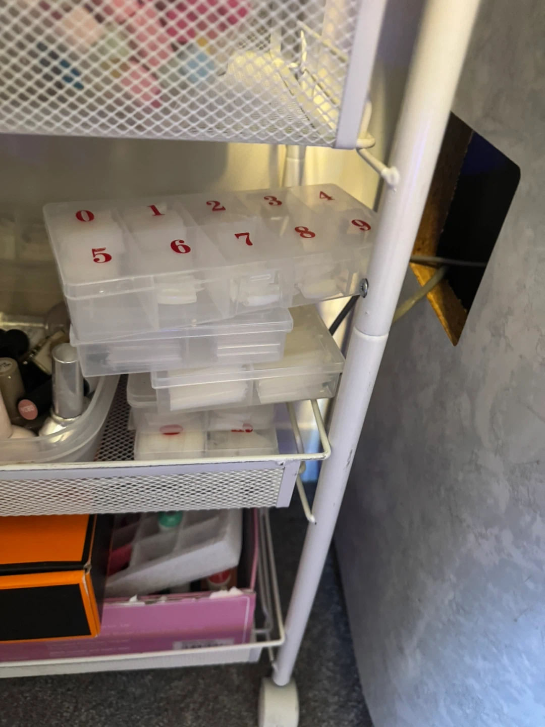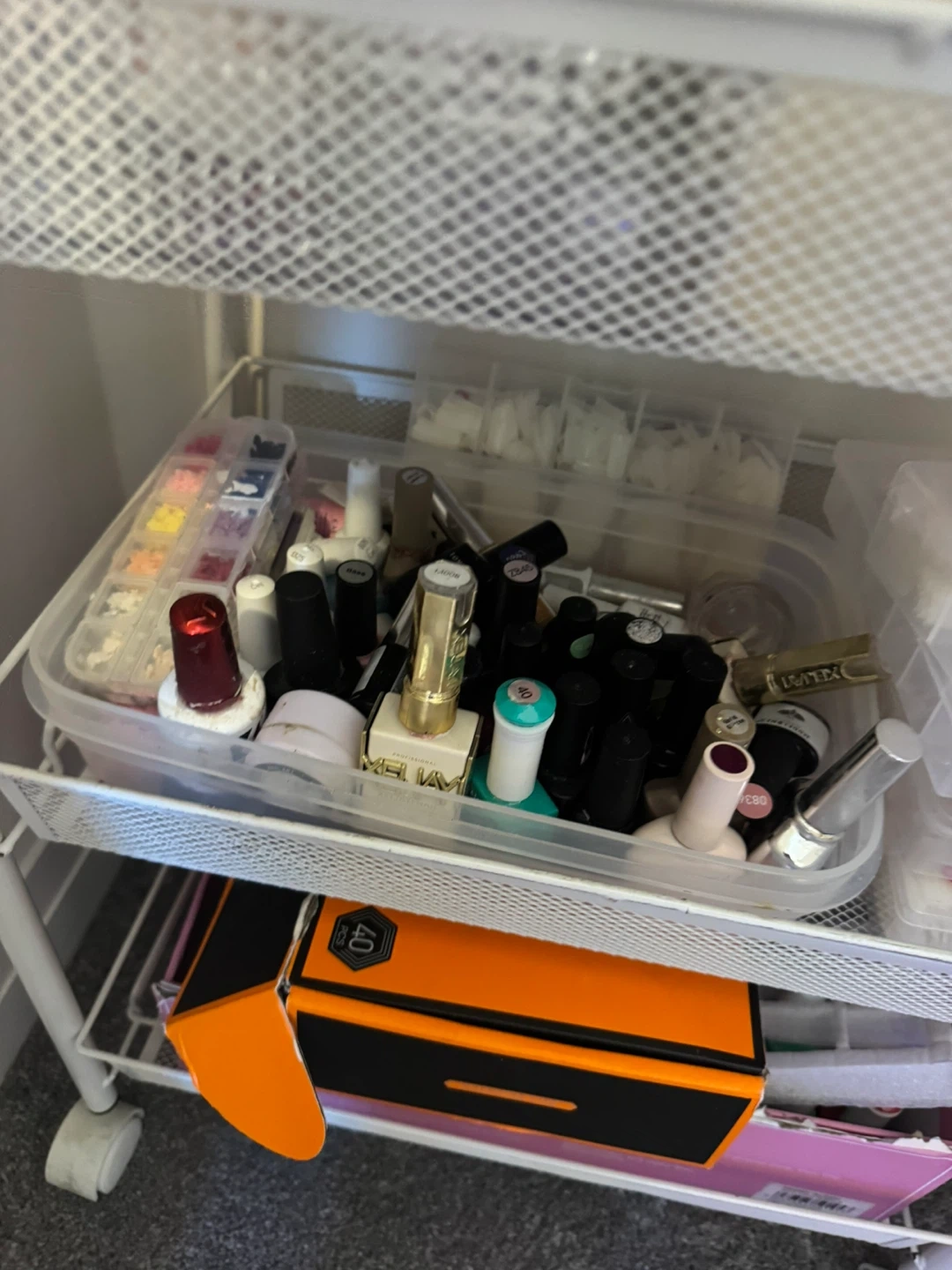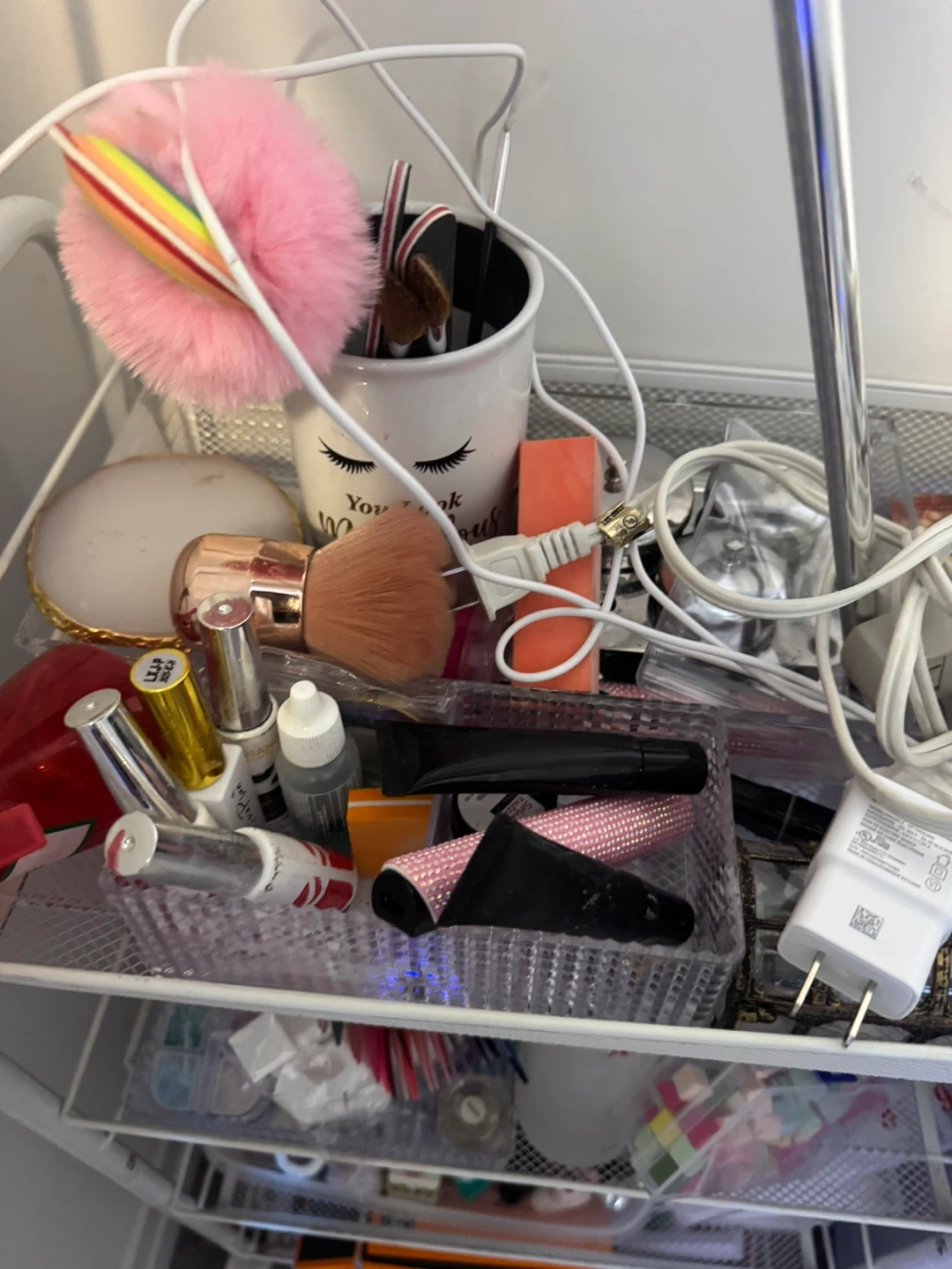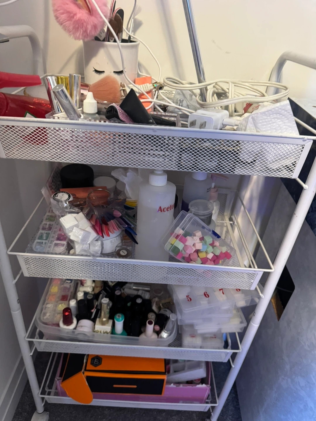 Three-tier rolling cart filled with various nail polishes, art supplies, and tools. Includes a UV nail lamp, charging brick, makeup brushes, and storage containers.