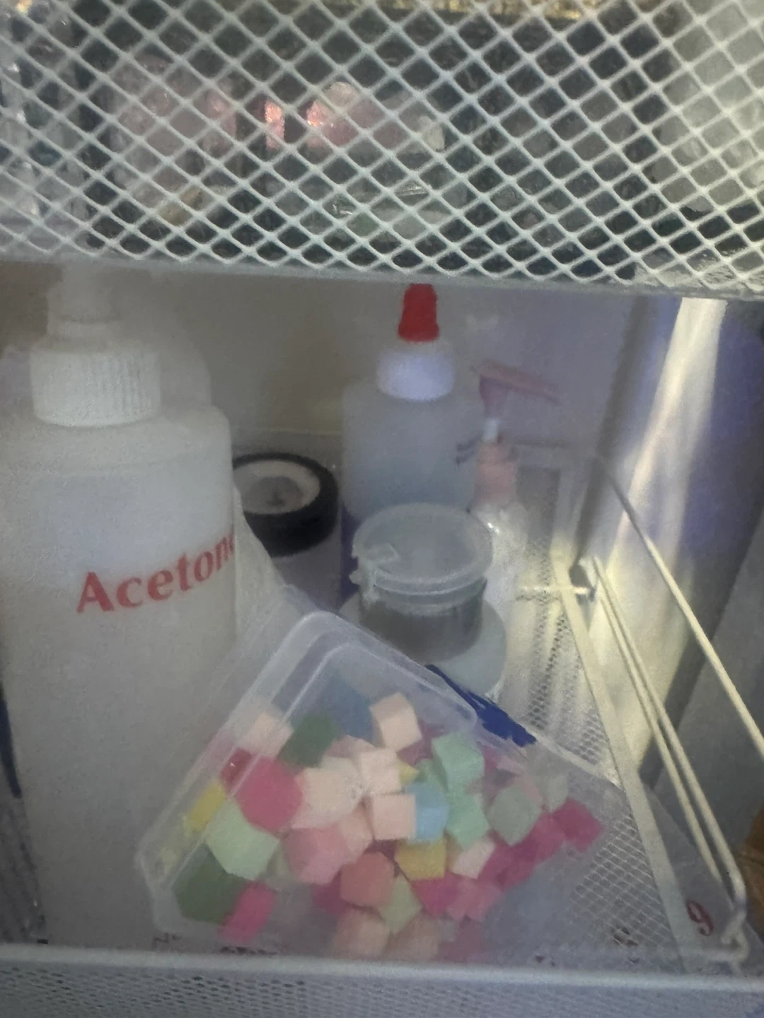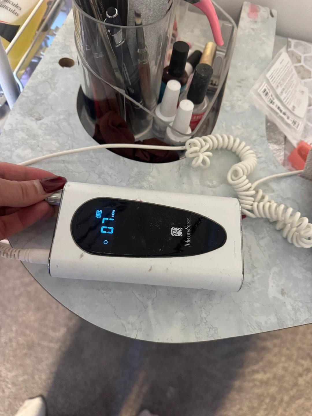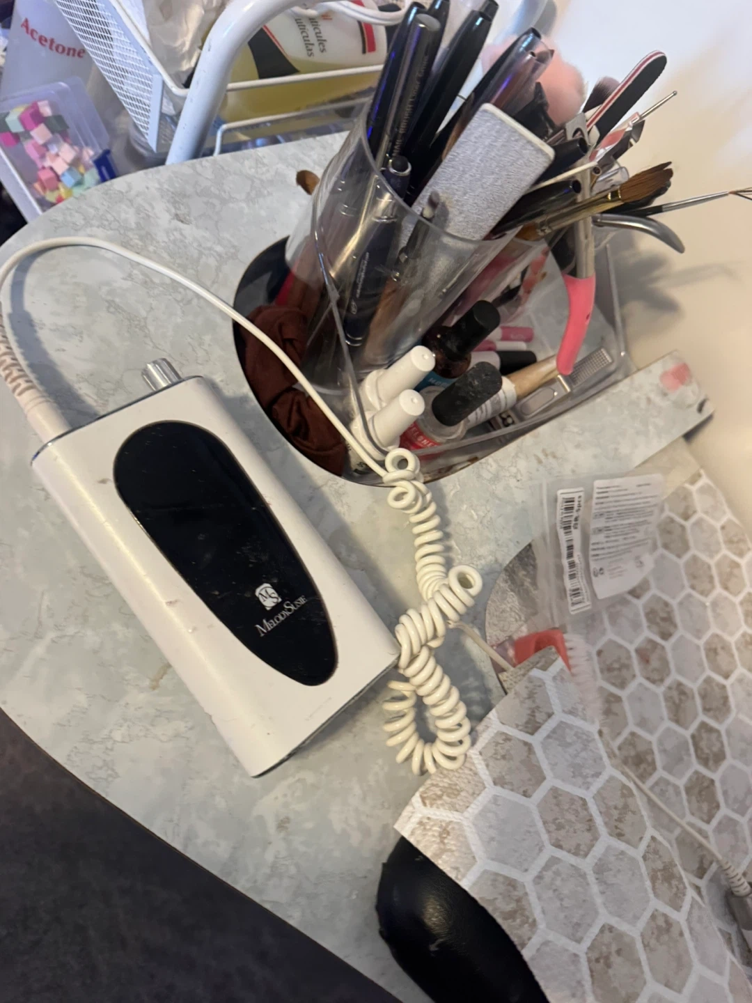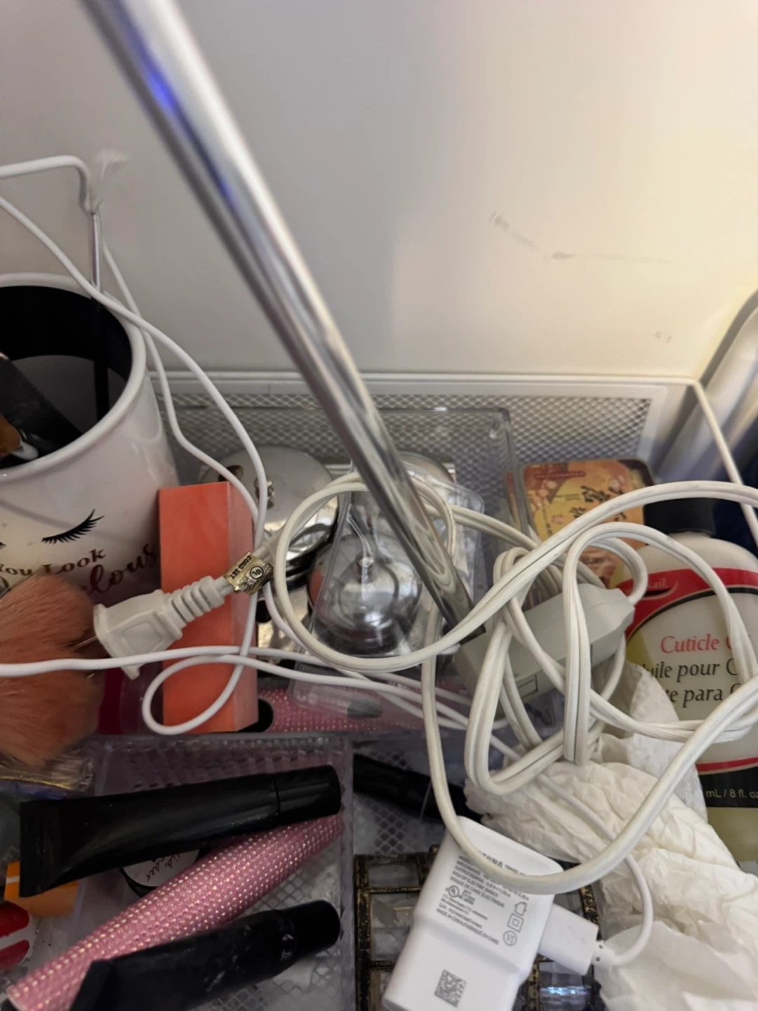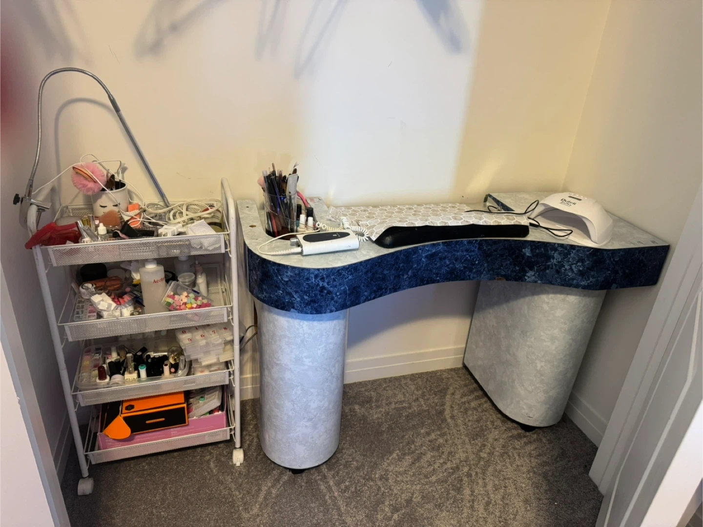 Three-tier rolling cart filled with various nail polishes, art supplies, and tools. Includes a UV nail lamp, charging brick, makeup brushes, and storage containers.