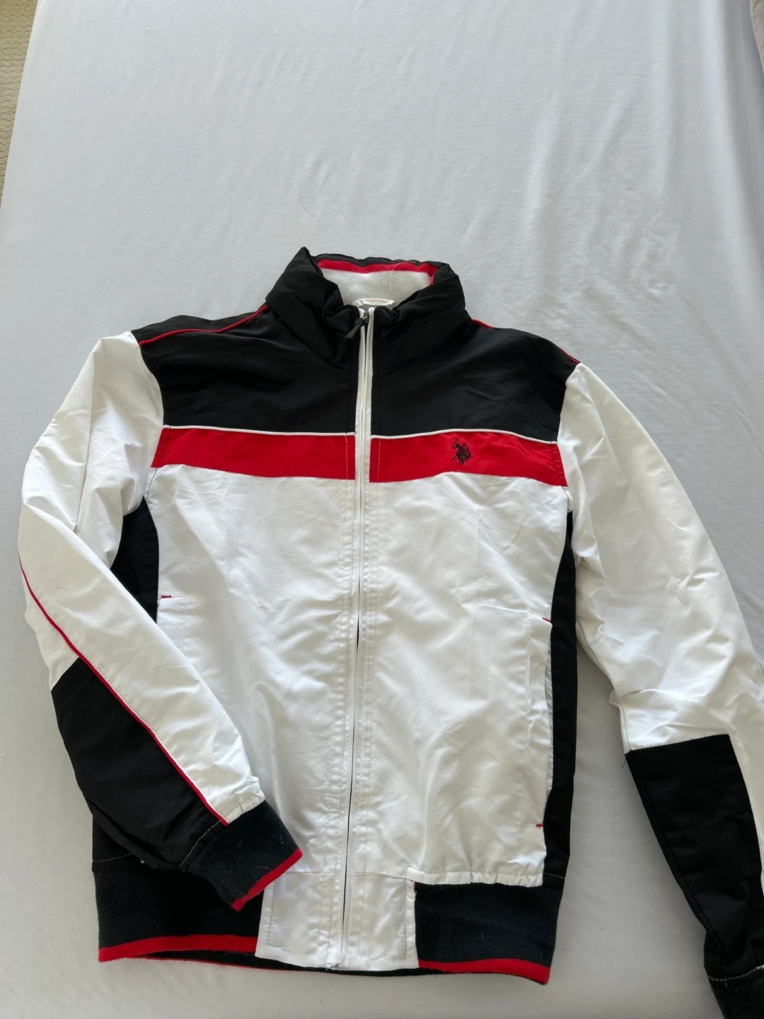Track jacket with a 'USA' design on the back. Features a full zip front and contrasting colour panels. It's made from a lightweight material.