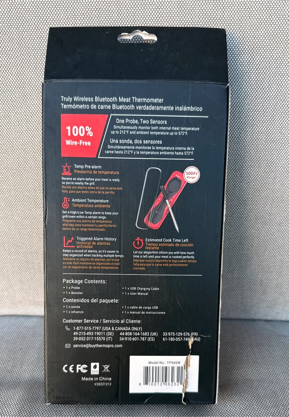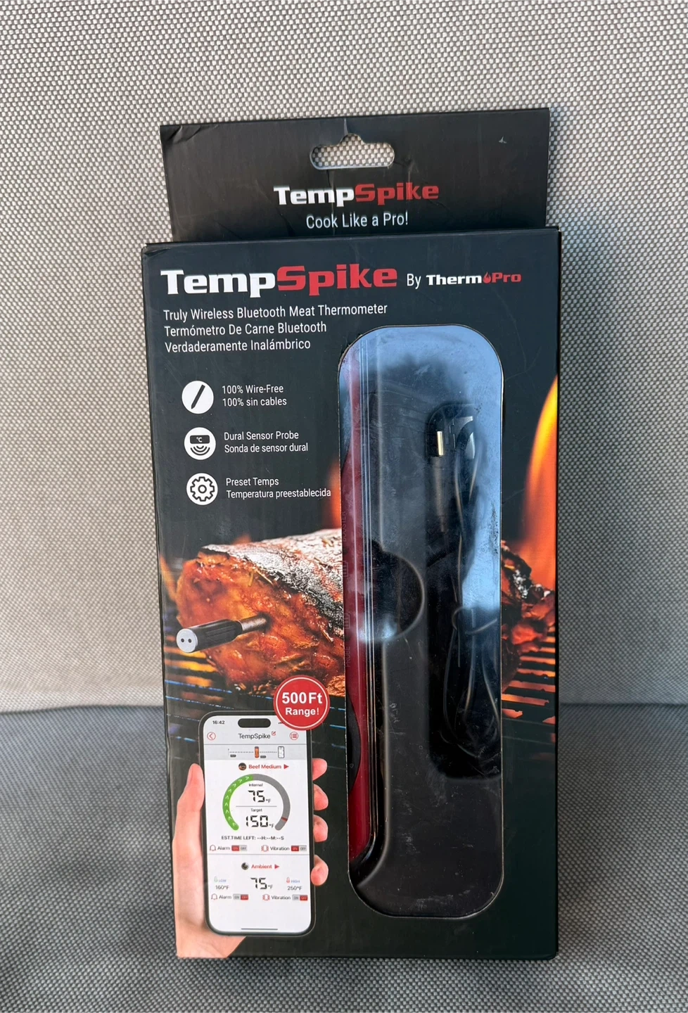 This is a truly wireless Bluetooth meat thermometer from TempSpike. It's 100% wire-free and includes a dual sensor probe. It has a 500ft range and a rechargeable battery.
