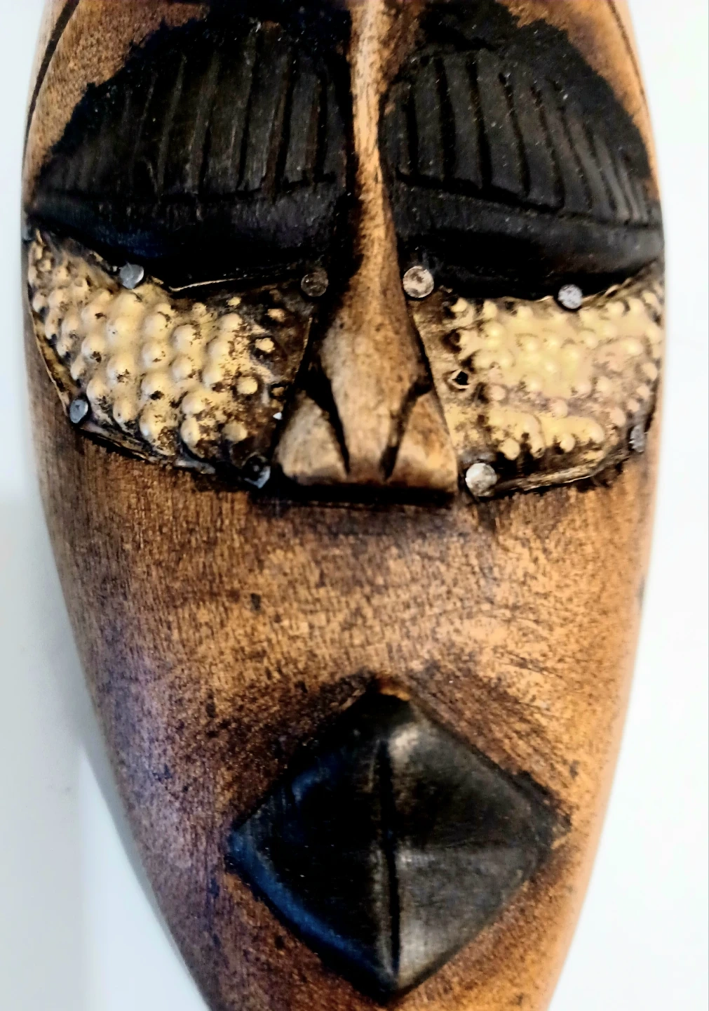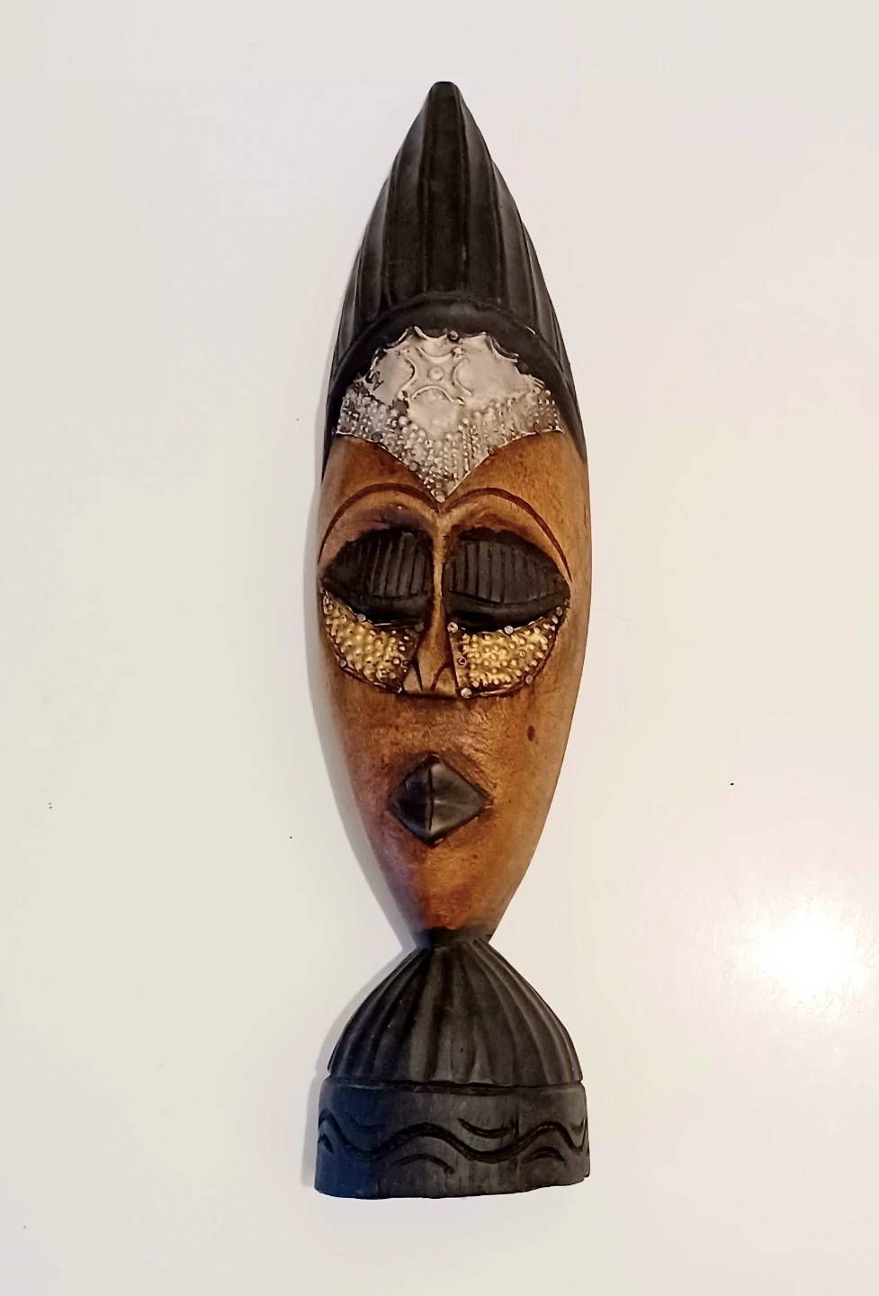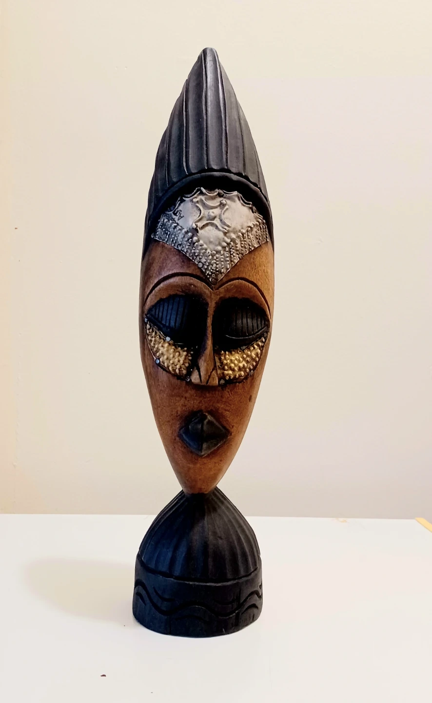Unique, One of a Kind, Vintage Striking piece of Hand Crafted Art, Hand-hammered Stamped Silver Forehead and Hand Hammered Brass Cheeks , Tall Hand Crafted Wooden Table/Mantel Decor Mask
