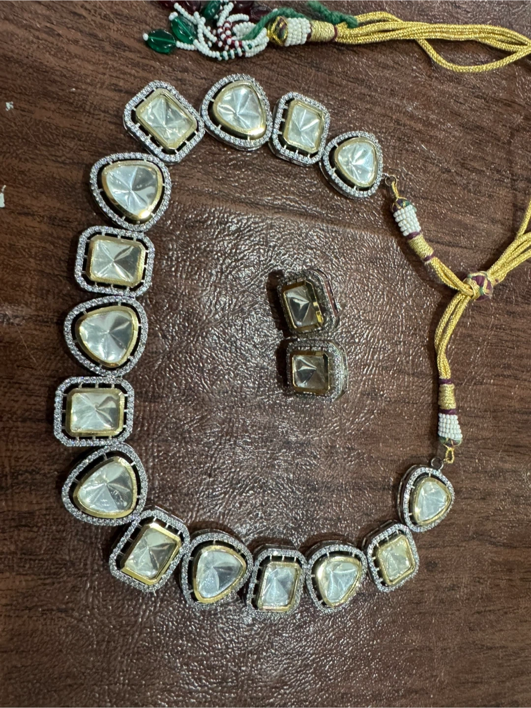 This set includes a statement necklace and matching stud earrings, both adorned with clear, faceted stones. The jewellery features a gold-tone finish with silver-tone accents around the stones. It's perfect for adding a touch of sparkle to formal occasions or special events.