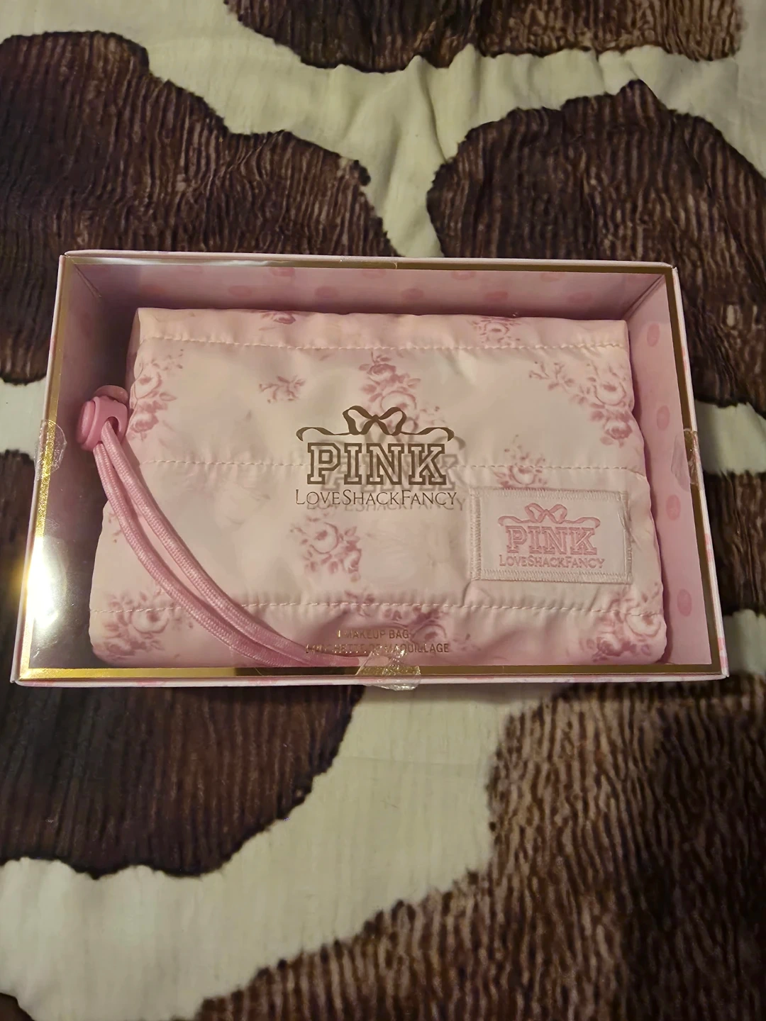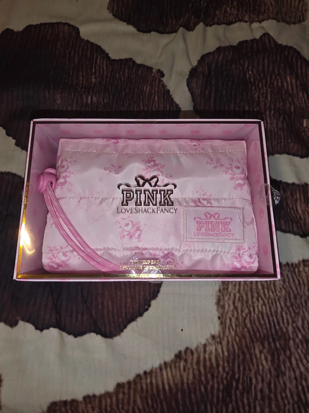 Brand new PINK Loveshackfancy makeup bag! In the color Beaux Icons. It comes in the original box, making it perfect for gifting or treating yourself. The bag features a cute floral design and a convenient drawstring closure