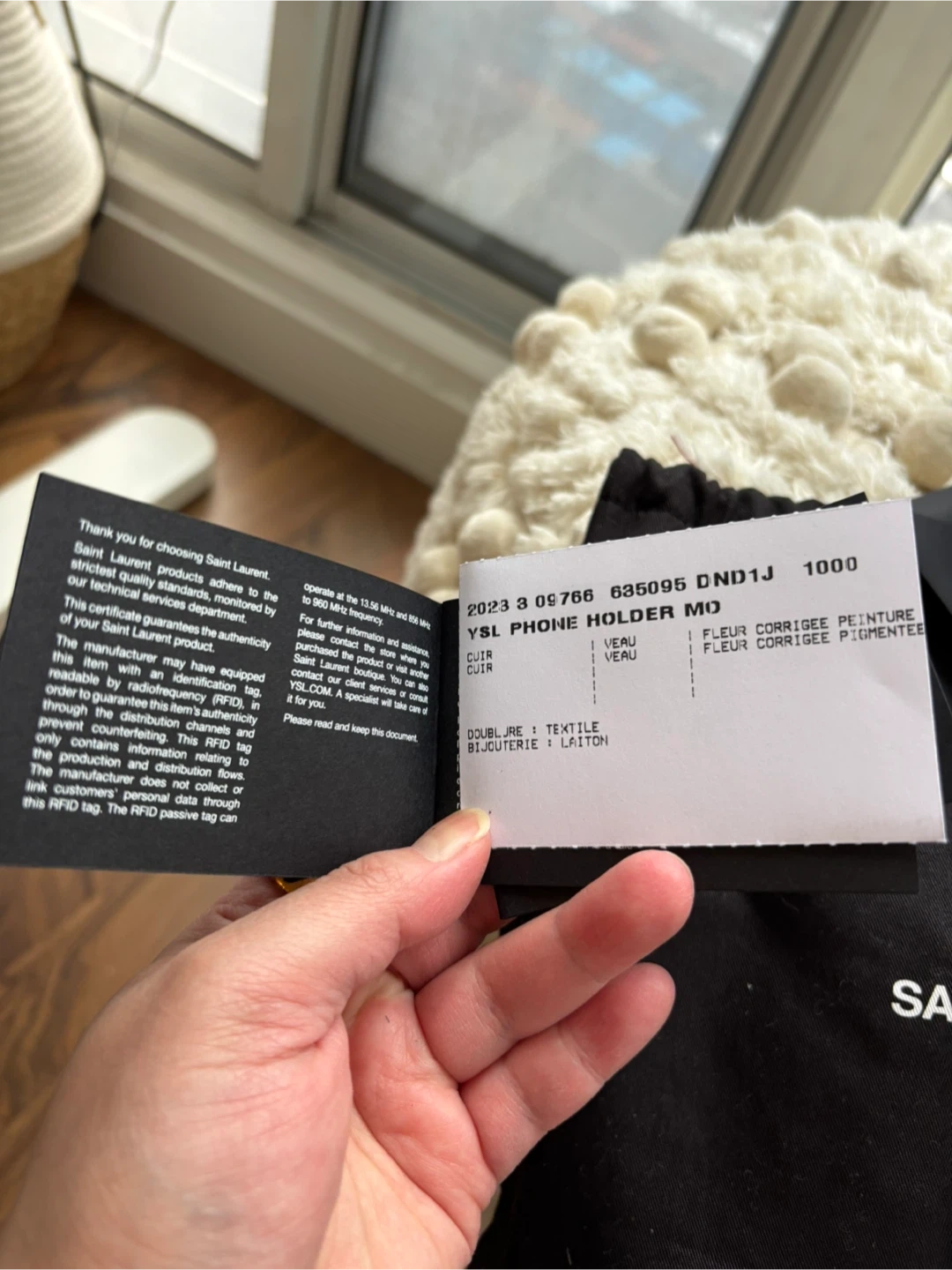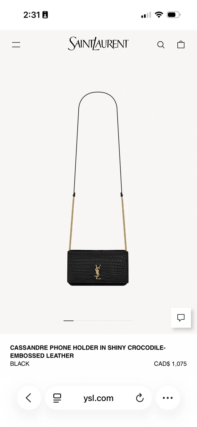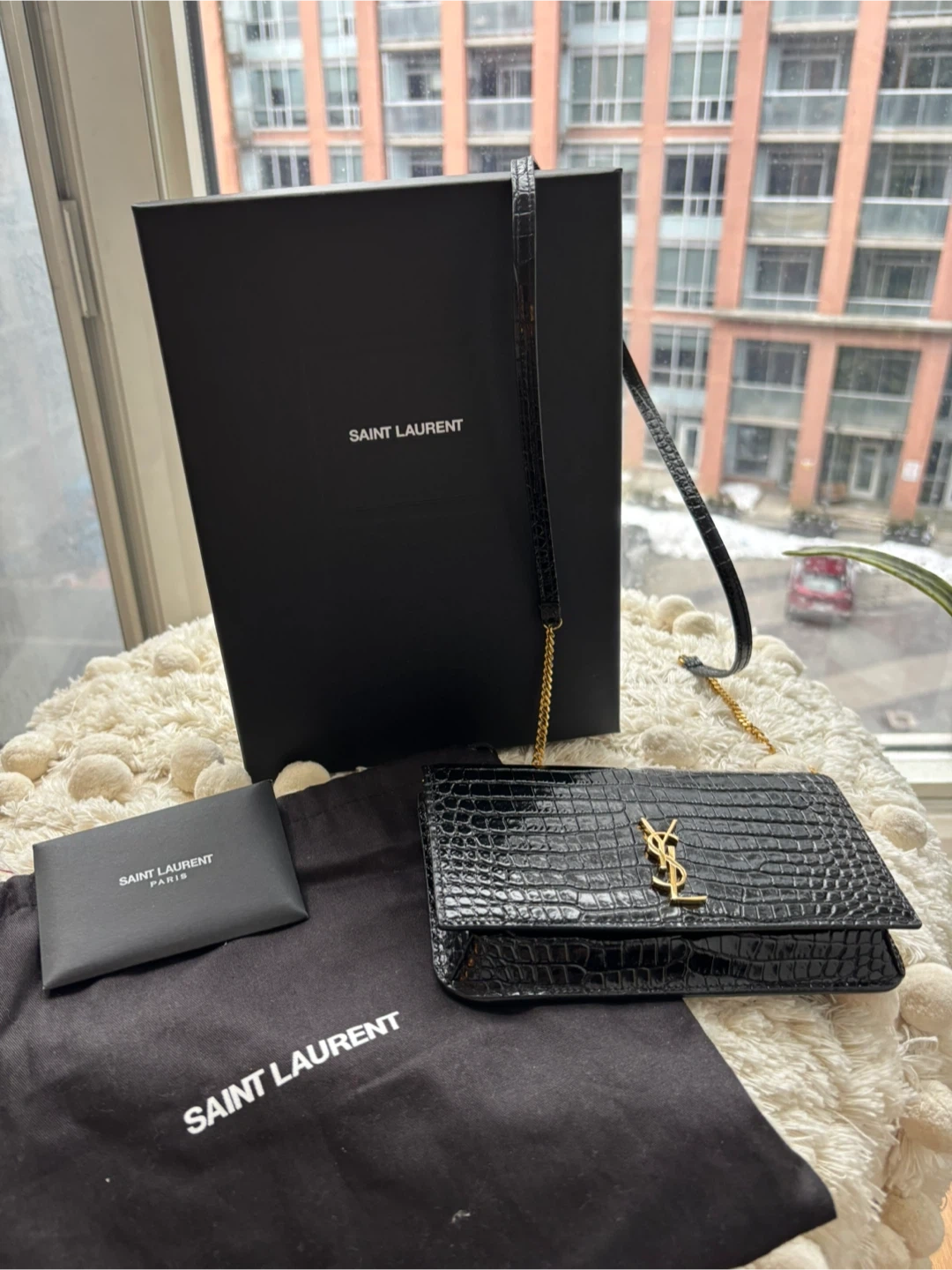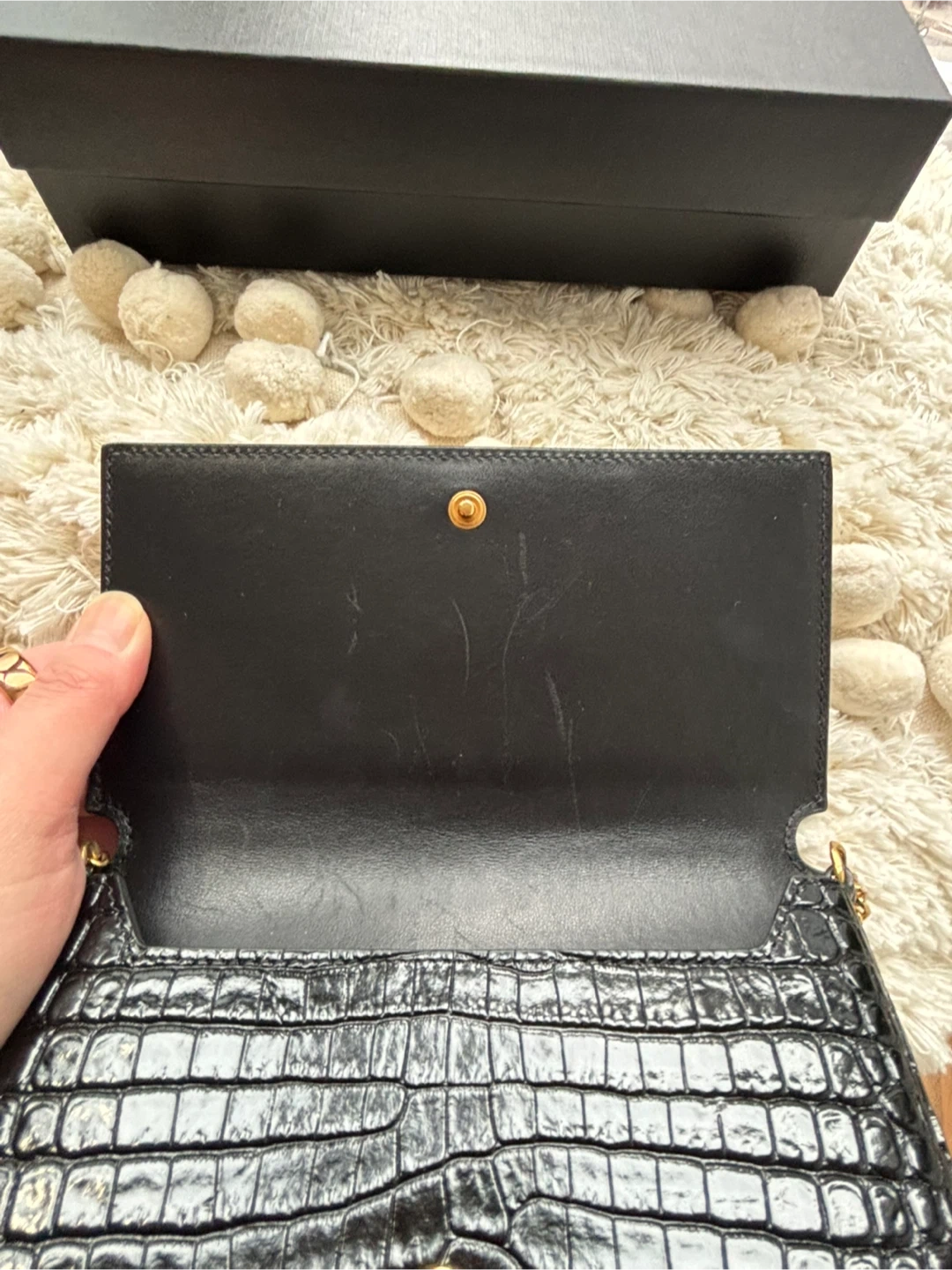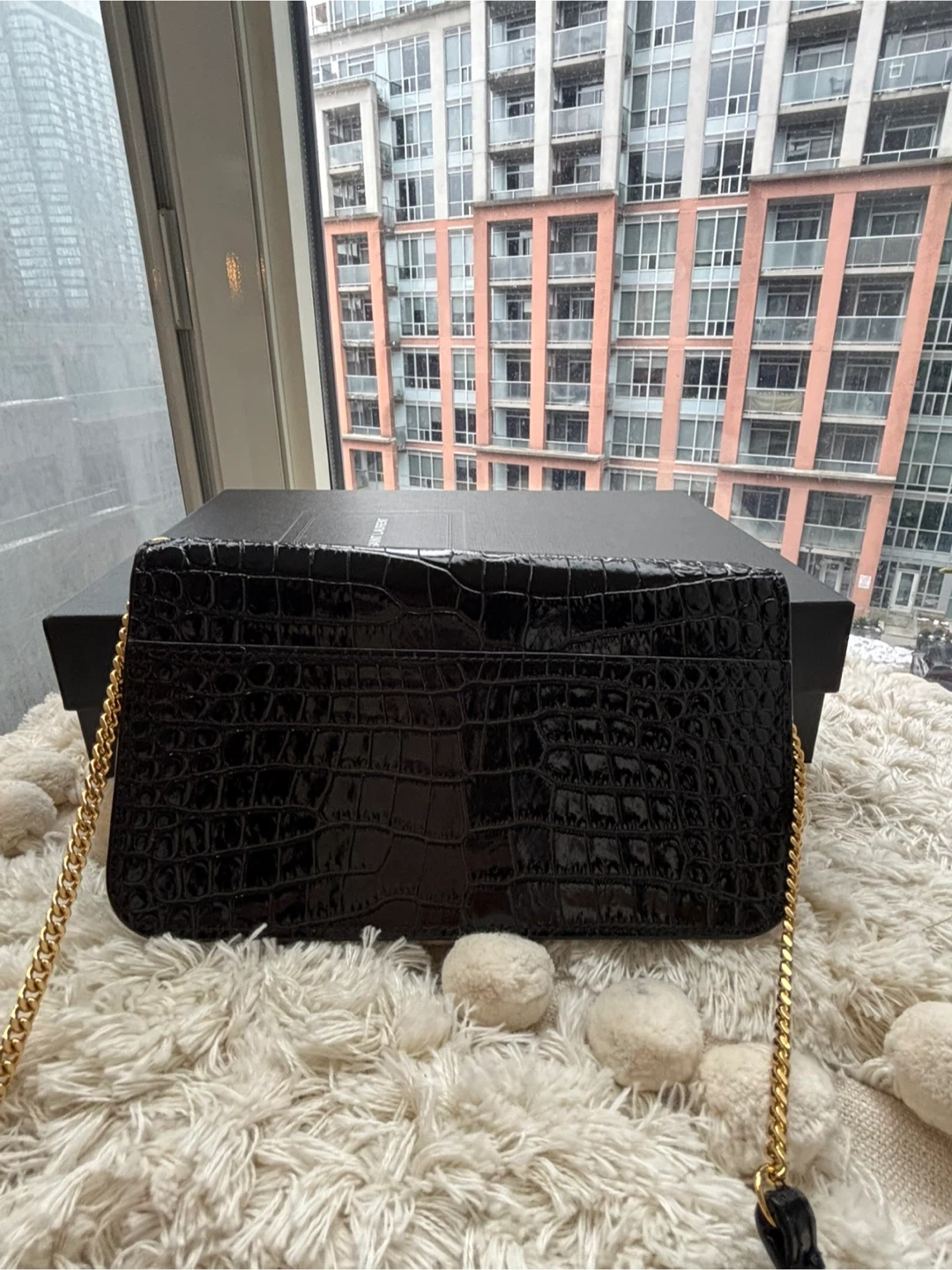 Elegant croc black phone holder by Saint Laurent. It features a gold-tone chain strap and the iconic YSL logo hardware. Sleek and versatile design.