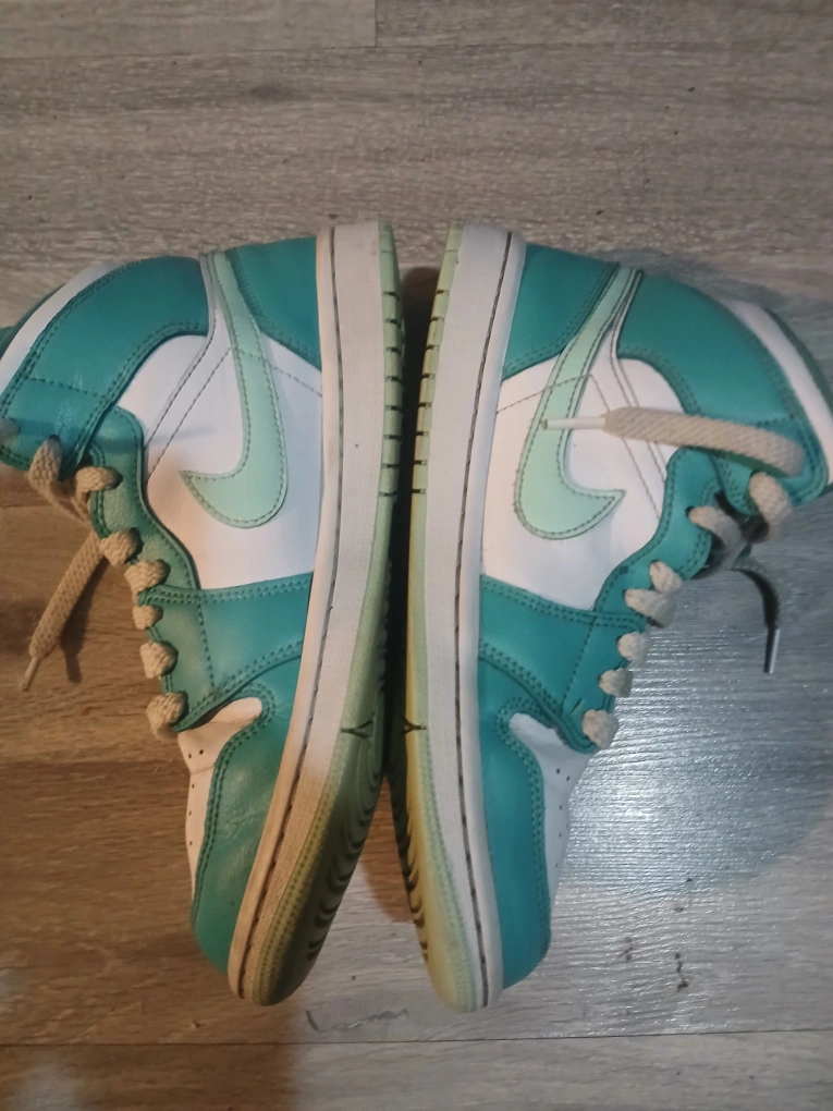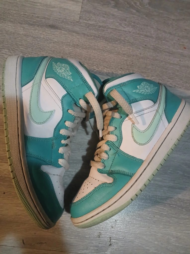 Pre-owned Air Jordan 1 Mid SE sneakers. Light aqua colourway. Size 7 US women's. Some wear and tear.