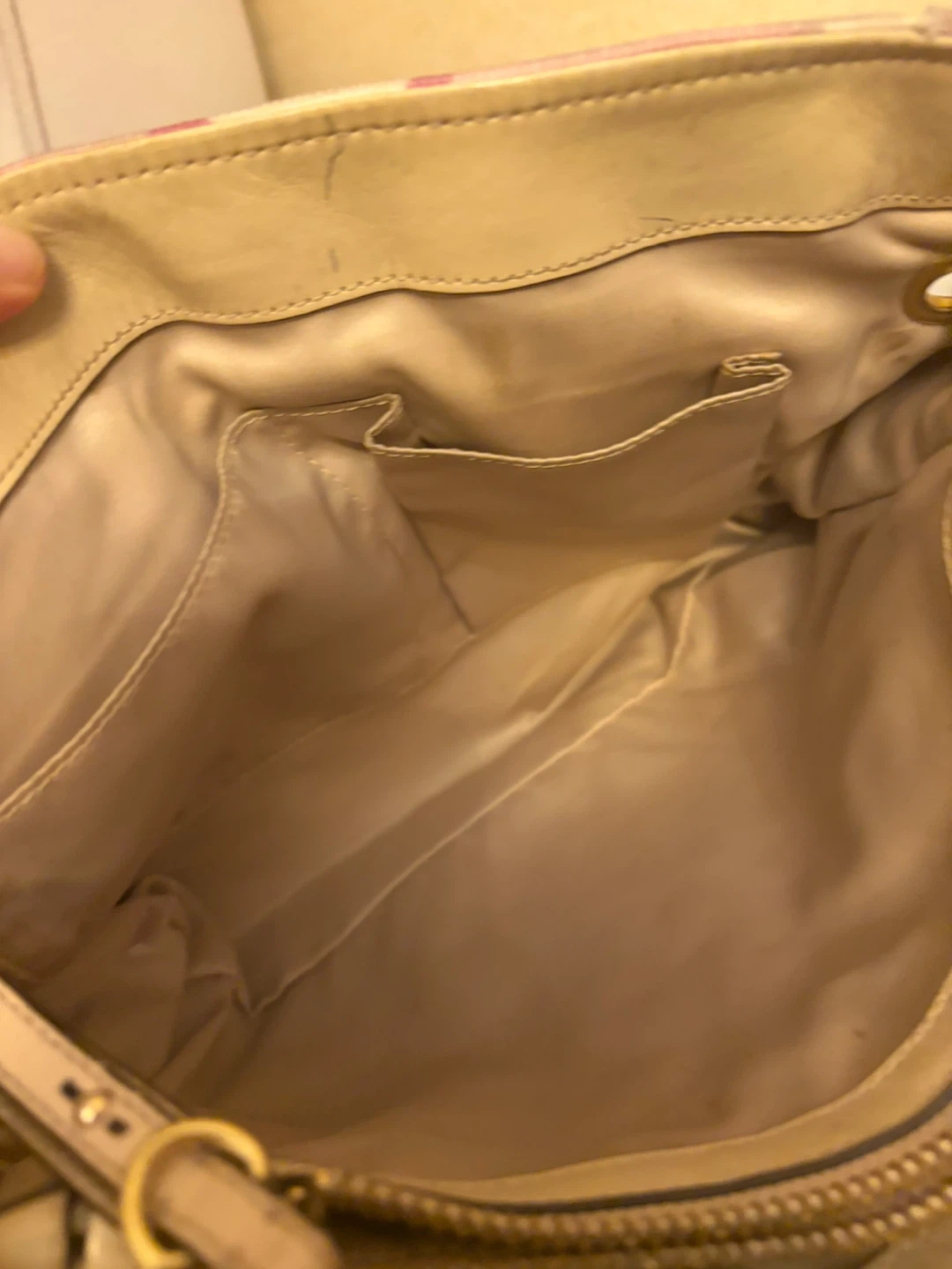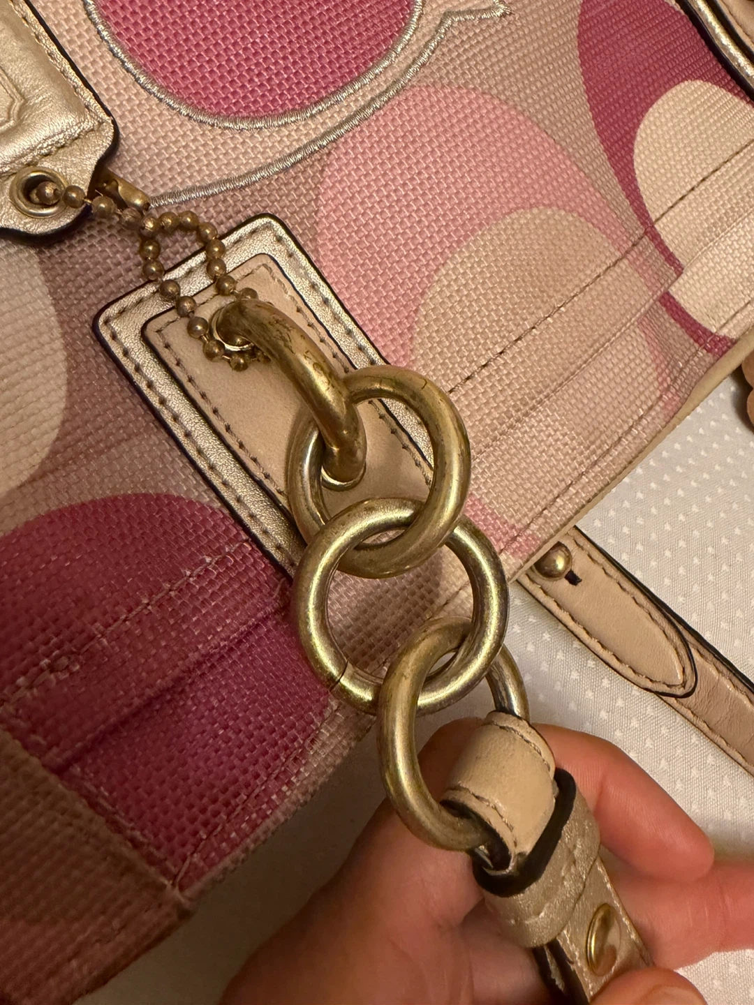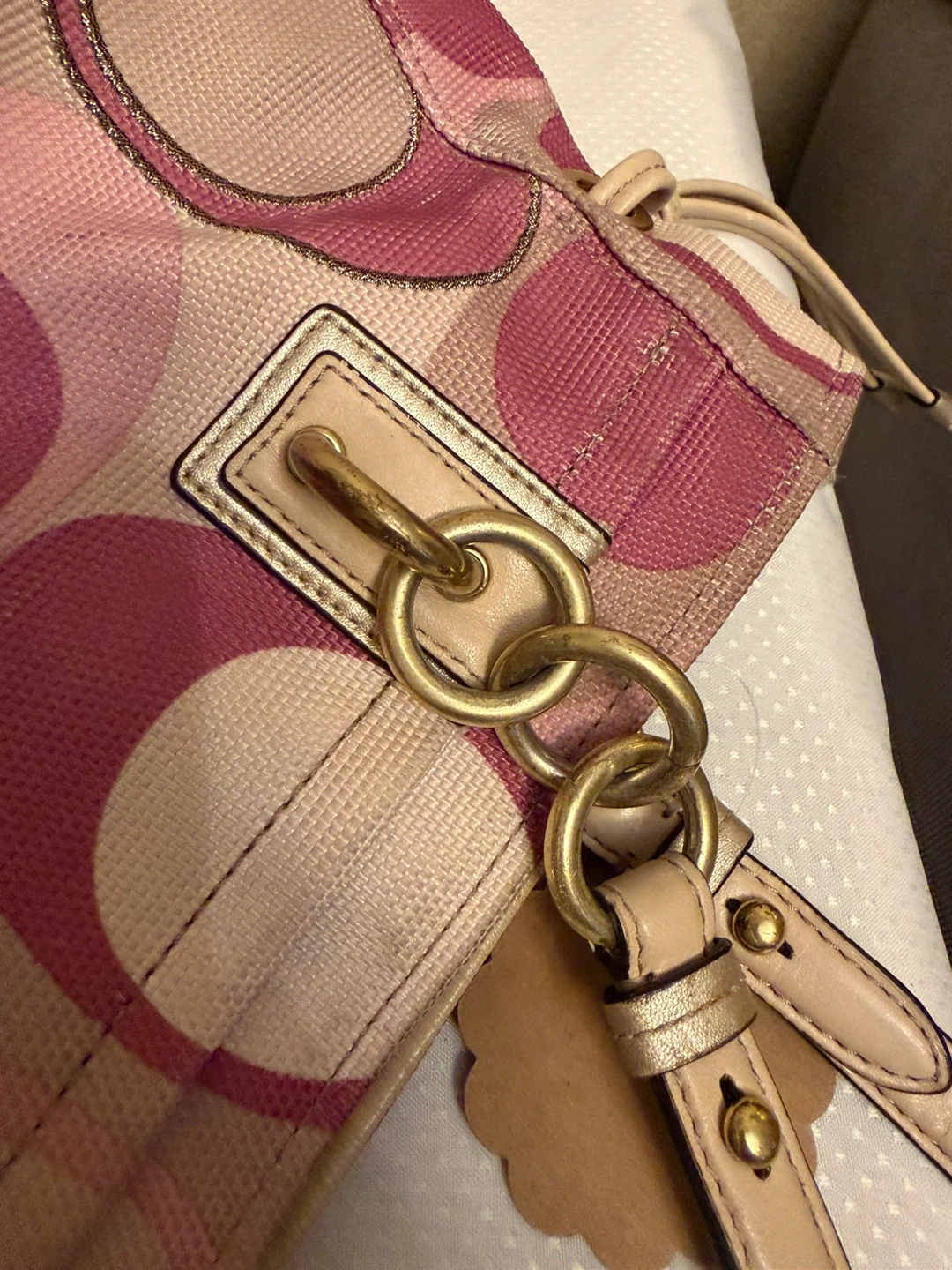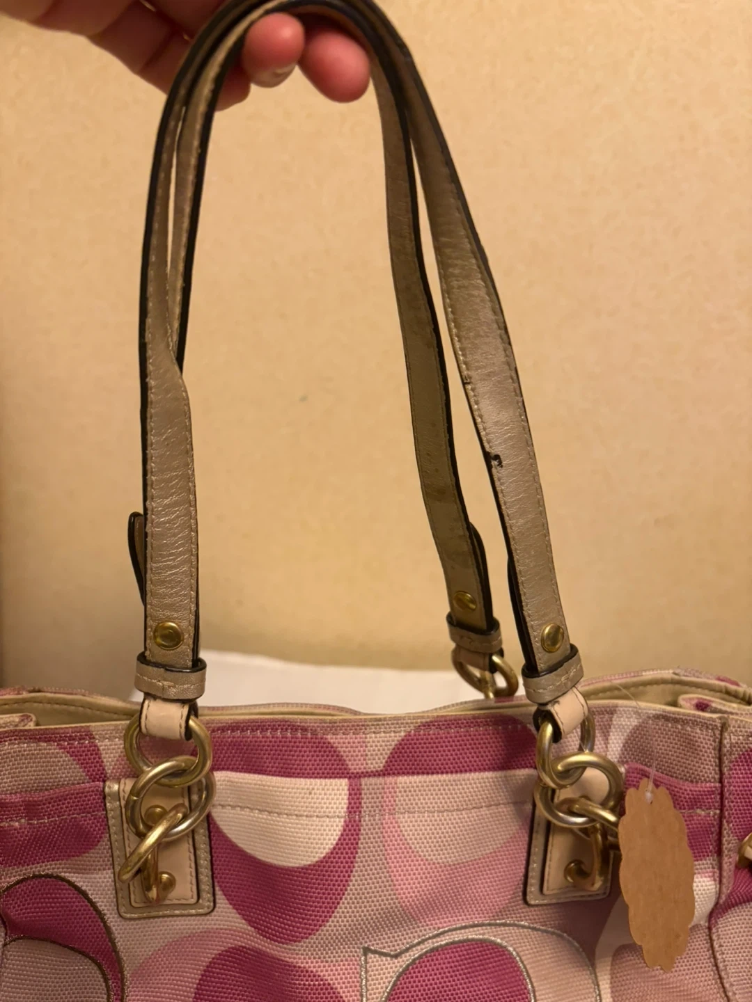 Coach tote bag with the signature 'C' pattern. Features pink and multi-colored fabric with tan leather trim and gold hardware. It's a stylish accessory for everyday use! Hardware and handles in ok condition . Inside is very clean .