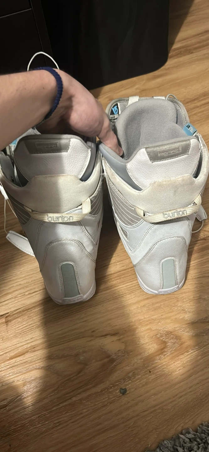 White Burton Mint snowboard boots. Women's US size 8.5 (EUR 40.5). These boots feature a comfortable liner and secure lacing system for your rides. Great for hitting the slopes!