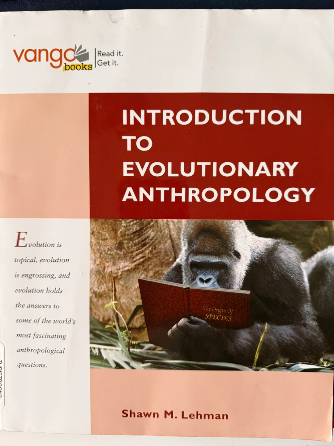 Textbook titled Introduction to Evolutionary Anthropology by Shawn M. Lehman. It covers fascinating anthropological questions. This book is useful for students of anthropology.