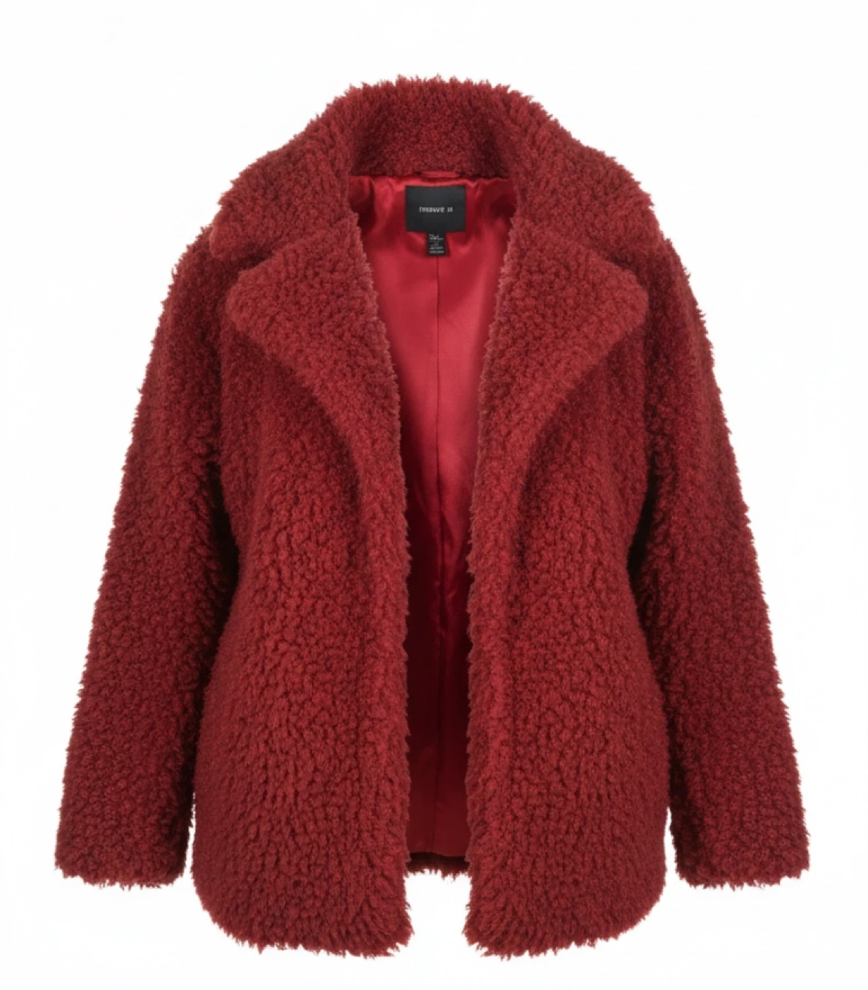 Cozy red teddy coat from Forever 21. It's a size medium with a silky red lining. This coat will keep you warm!