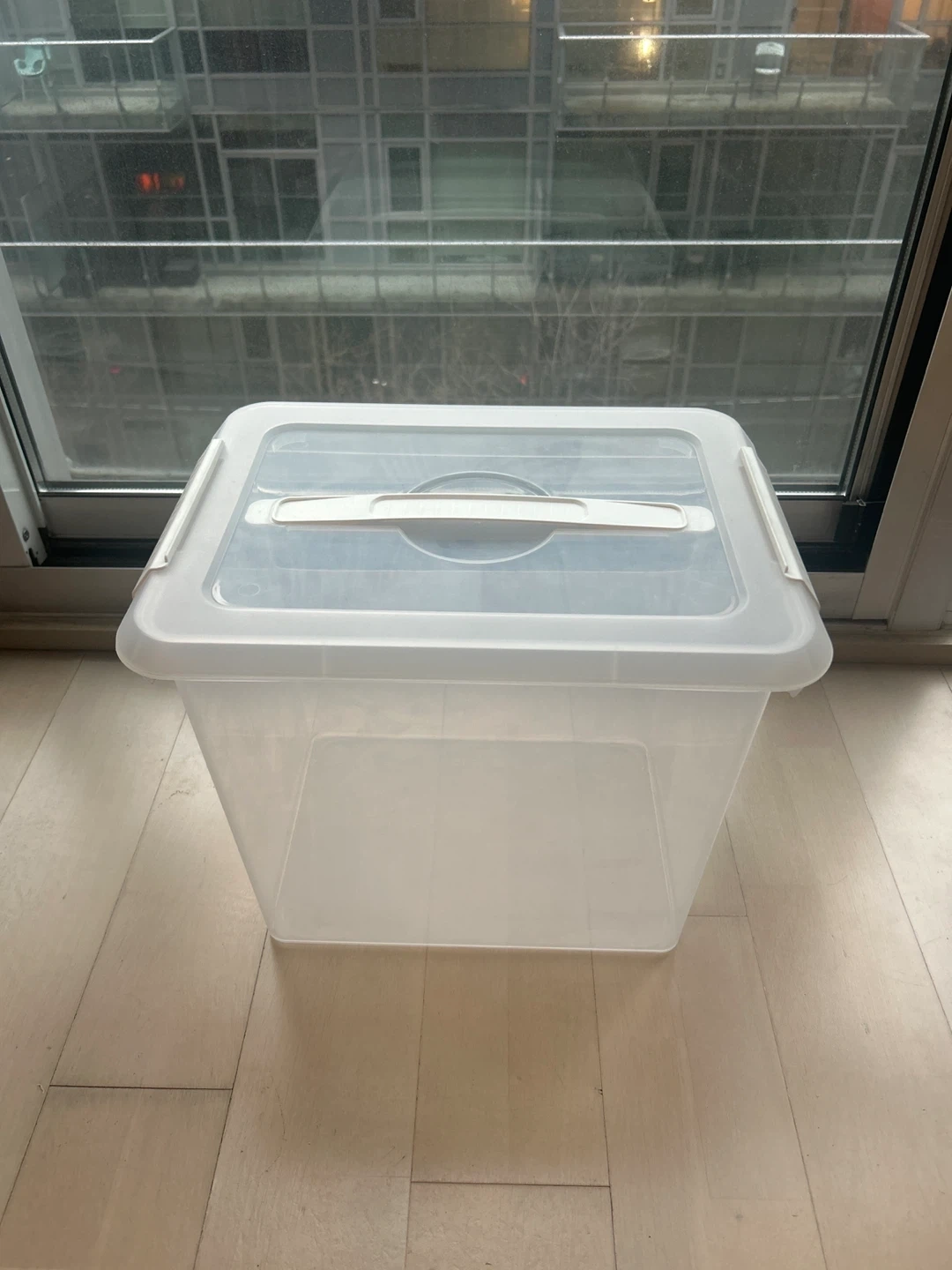 This is a clear plastic storage bin with a hinged lid and a handle. It's perfect for organizing various items around the house. The transparent design makes it easy to see what's inside.