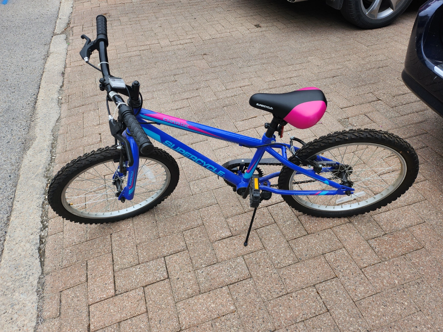 Girls bike, blue and pink. 20 inch wheels. New condition, only riden twice. Ready to ride.