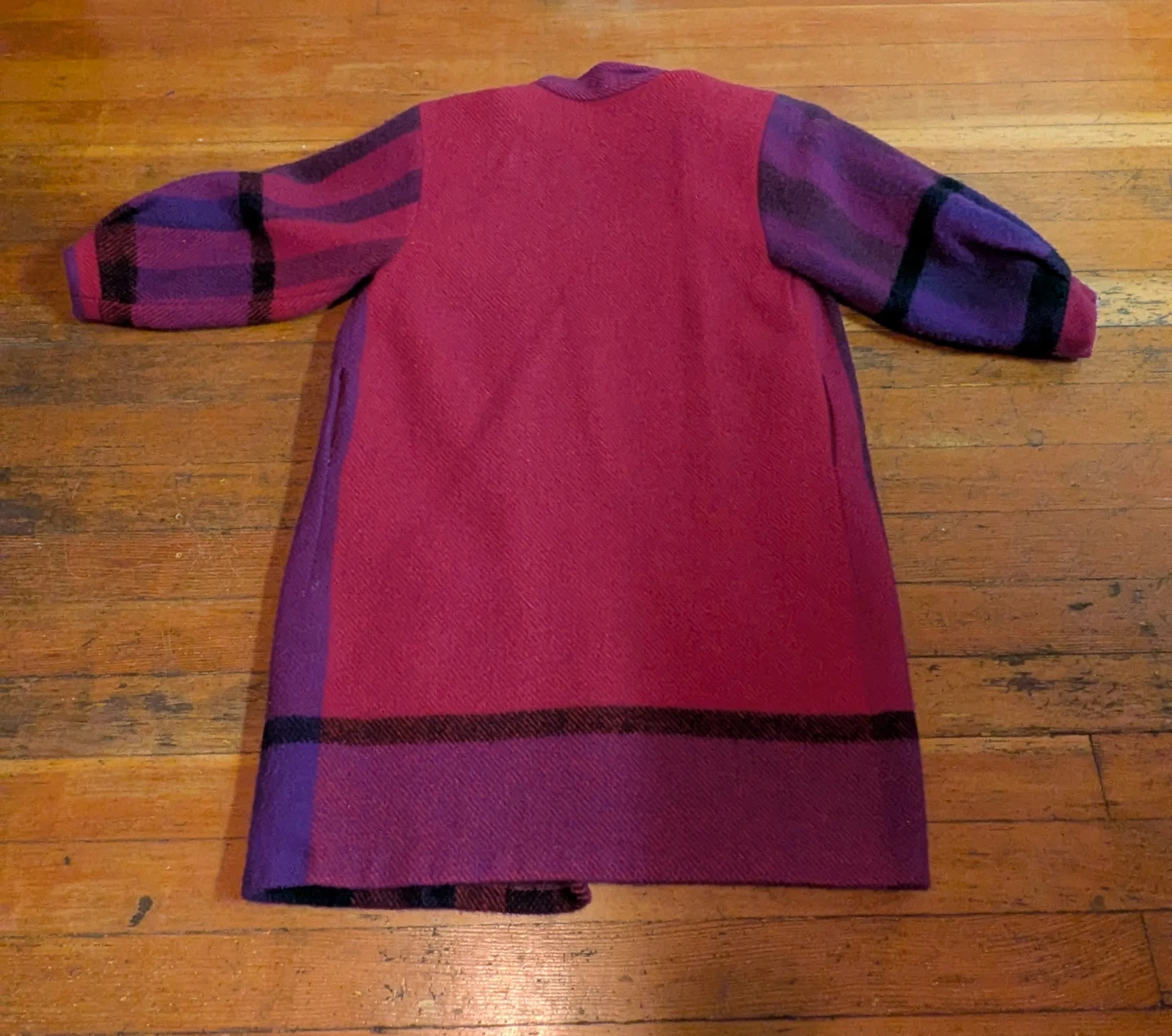 This Vintage Astrid Gjerlaug "Original" coat features a bold pink and purple plaid pattern. It's a unique piece with a button-up front. This coat would be great for adding a pop of colour to any outfit!