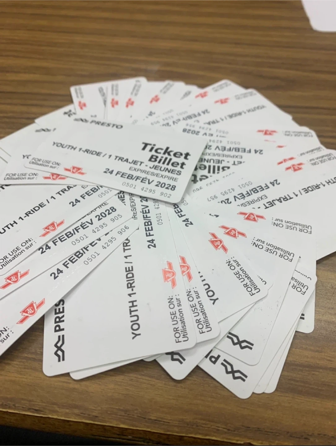 Bundle of youth transit tickets. Each ticket is valid for one ride. They expire on February 24, 2028. These tickets are for use on Presto transit.