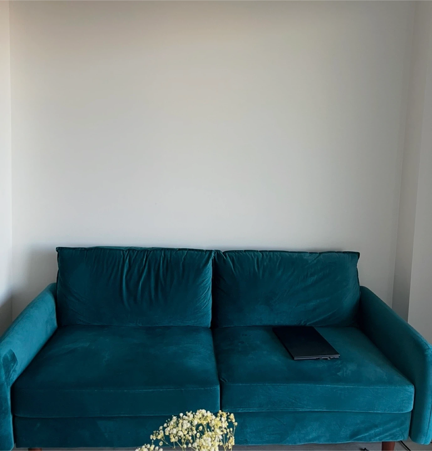 Teal velvet sofa. It's a two-seater couch with plush cushions. The material is soft velvet.