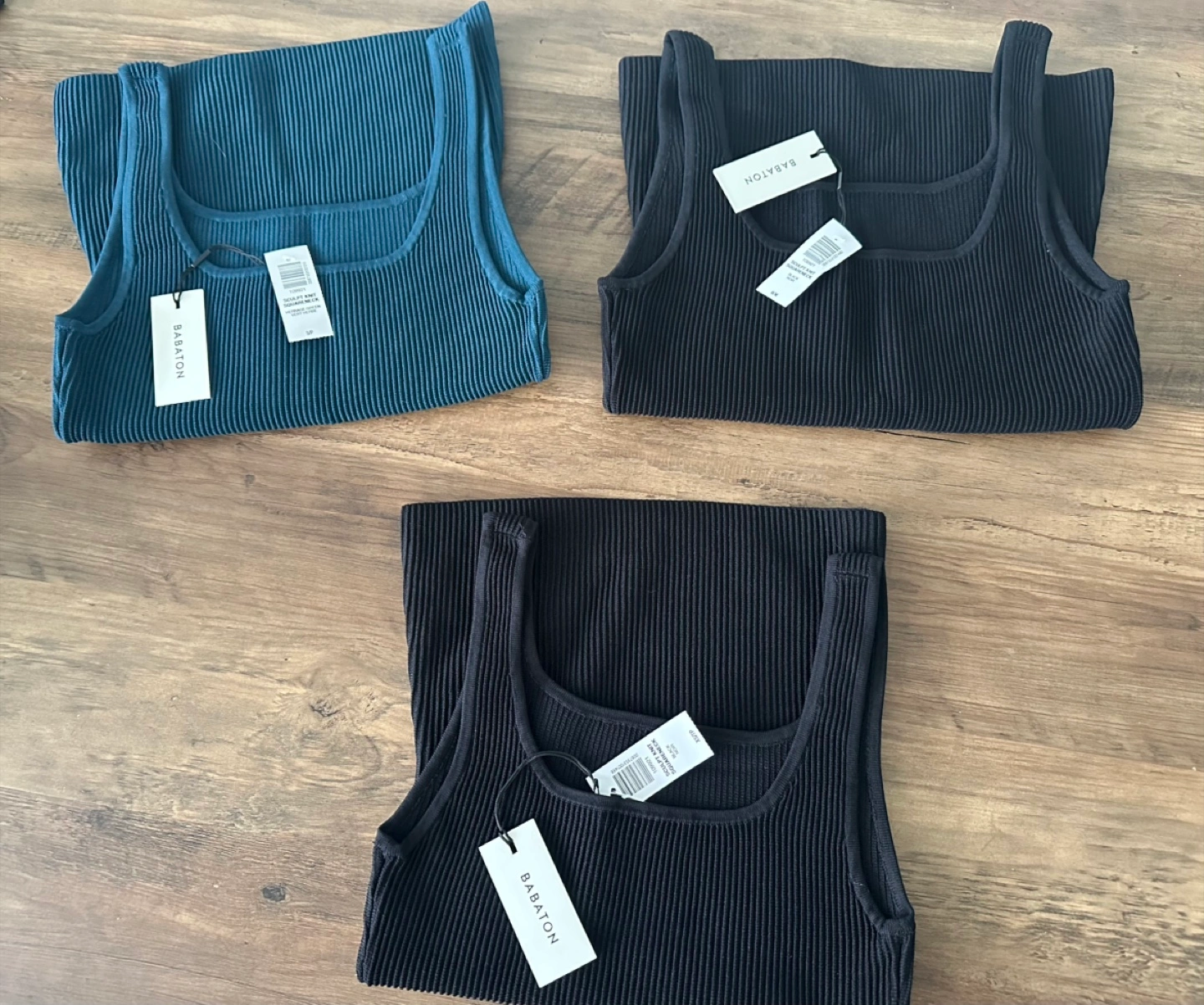 Three Babaton Sculpt Knit Tanks. Colours include teal and two blacks. Square neck. Ribbed knit fabric. New with tags. Each $50