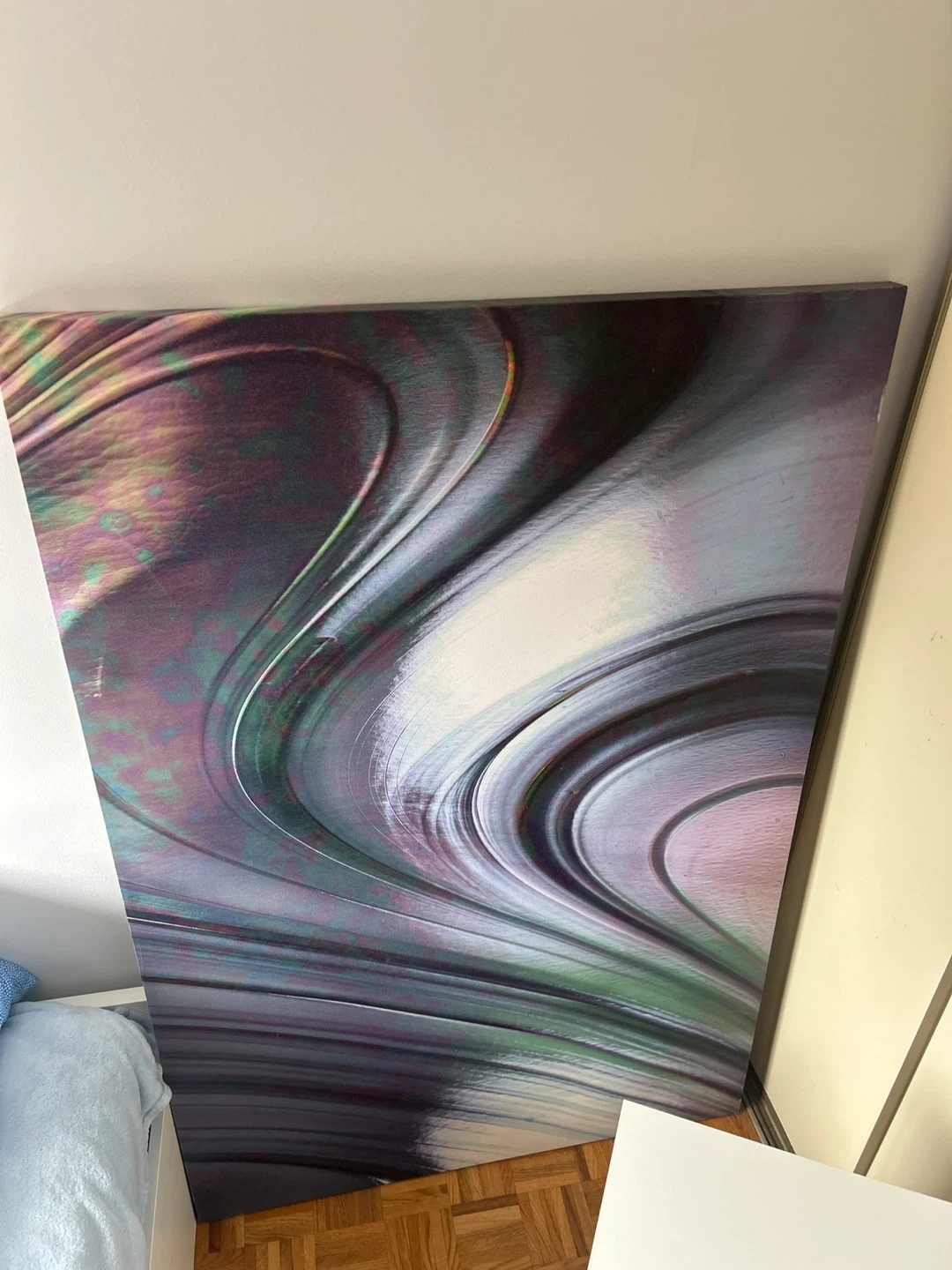 Large abstract canvas art print with a dynamic swirl design. Features metallic and iridescent tones. Ready to hang on your wall! Length is about 5 feet. Pick up only! Price is negotiable!!
