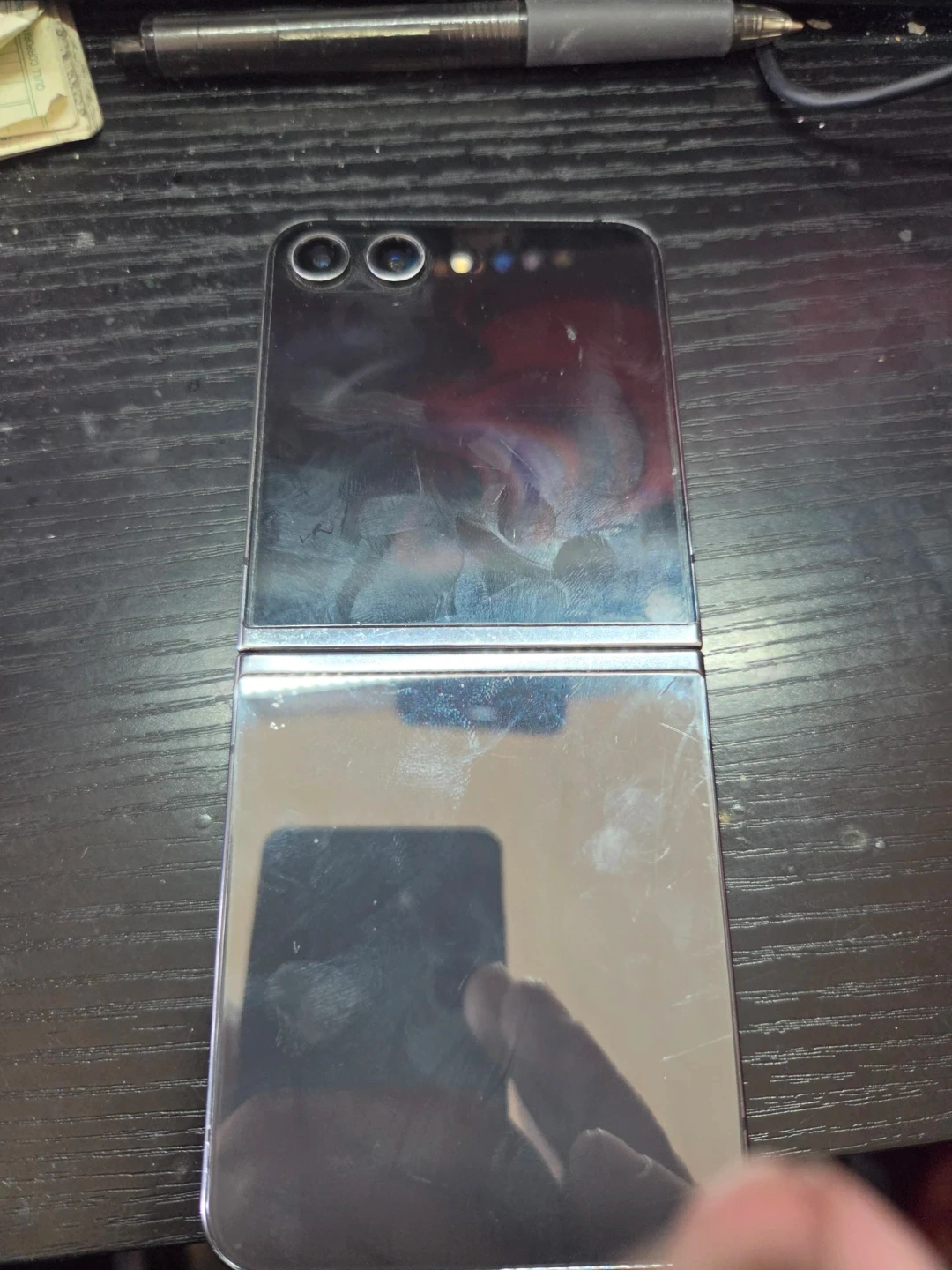 It's a Samsung Galaxy Z Flip 5 cell phone. The screen is a foldable dynamic AMOLED 2X display. It's black and has a dual-camera system. This phone would be useful for anyone wanting a compact smartphone!