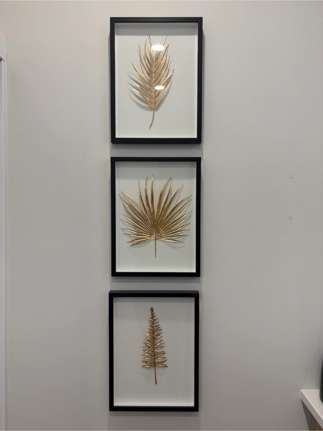 This set includes three framed pieces of wall art, each featuring a gold-finished botanical leaf on a white background. The frames are black. They're a stylish addition to any room!