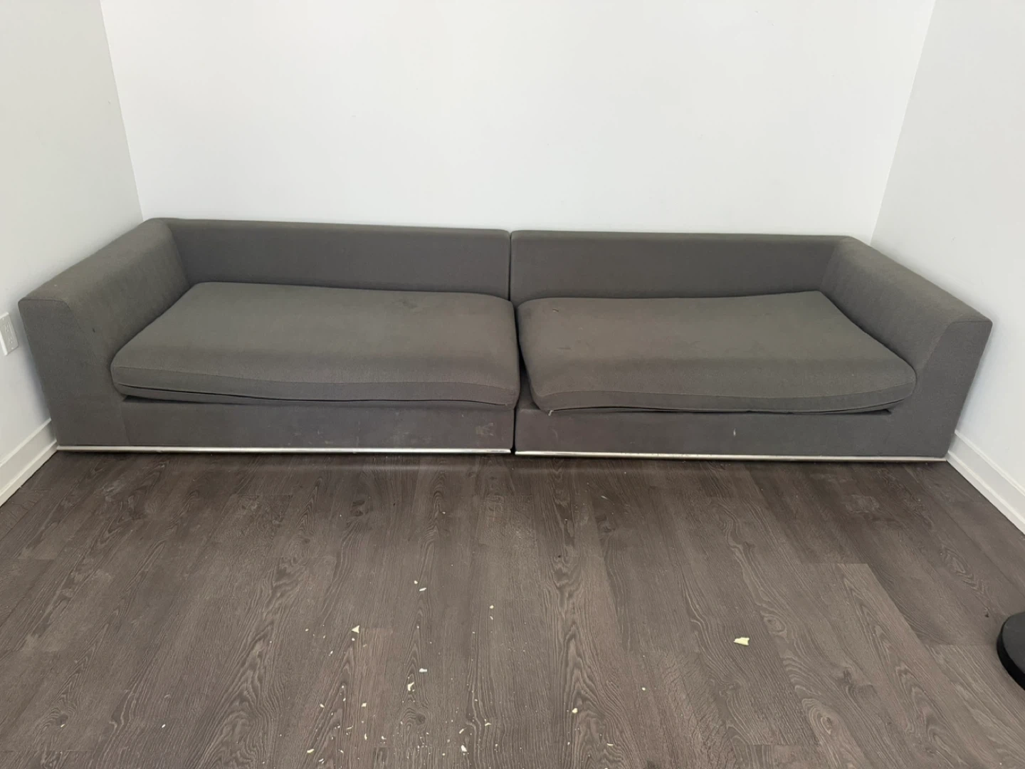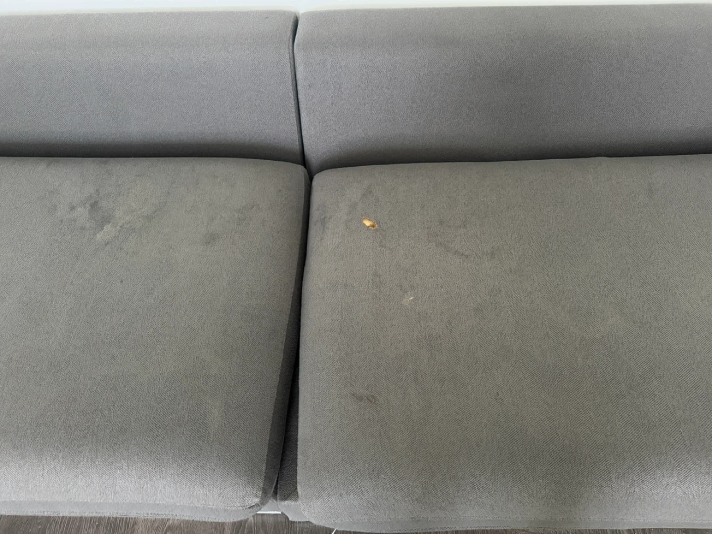 Grey fabric sofa with two seat cushions. Shows some minor wear marks on the fabric. A practical seating solution for any room.