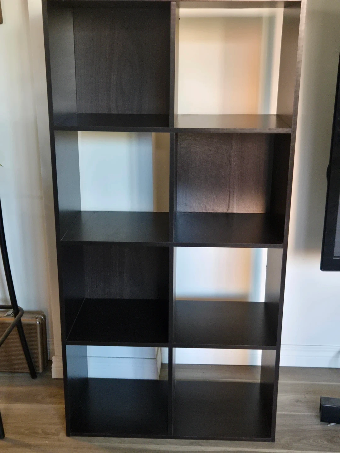 We have 2 8-cube storage shelves in a dark wood finish. They are versatile units that can hold books, decor, or general storage. The open-back design allows for easy cord management.