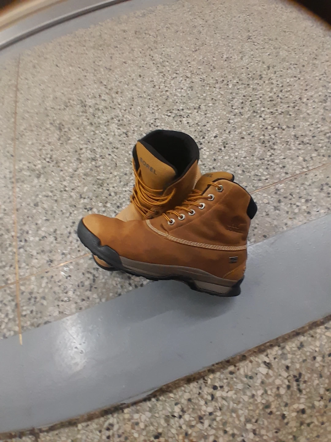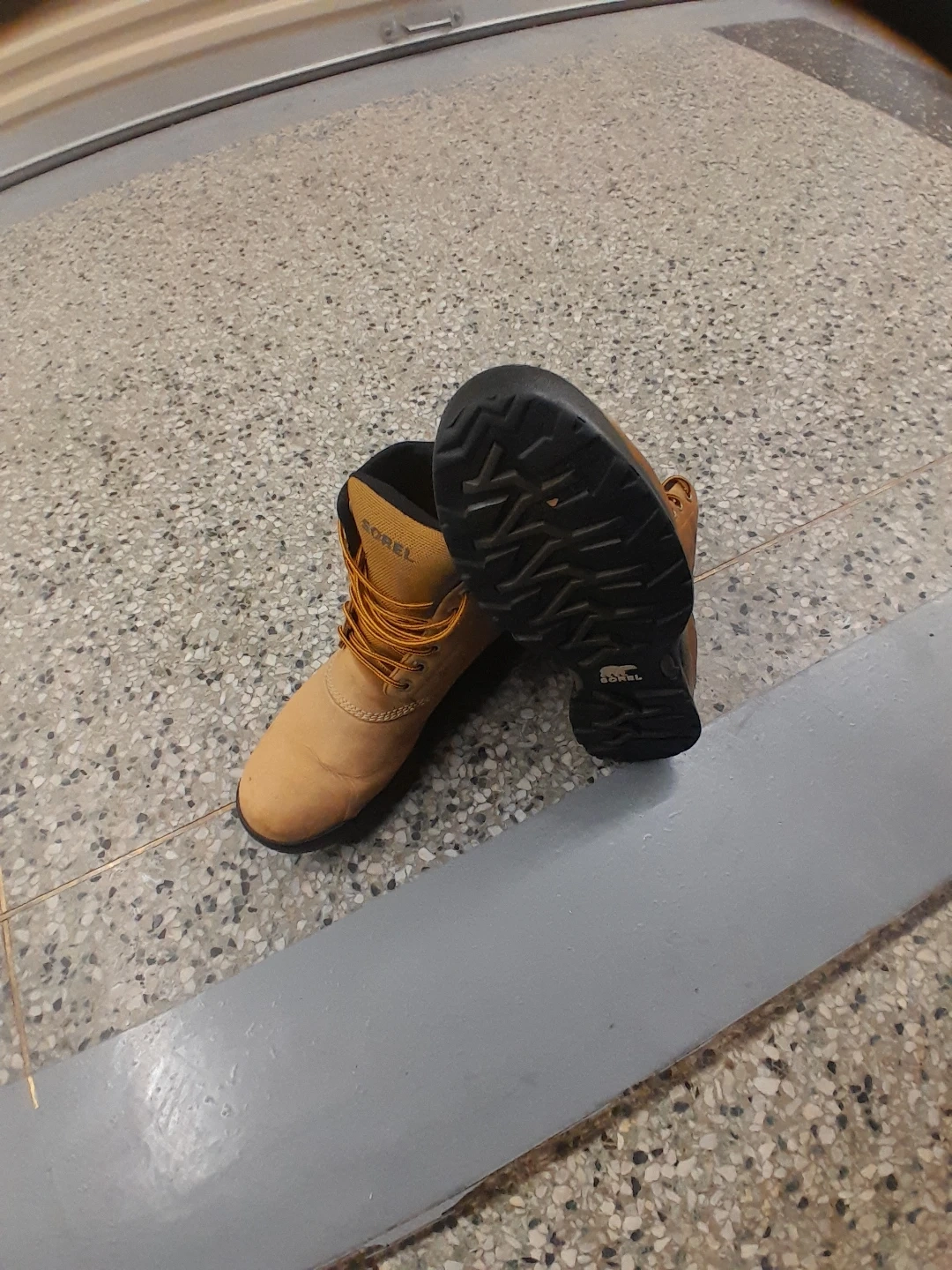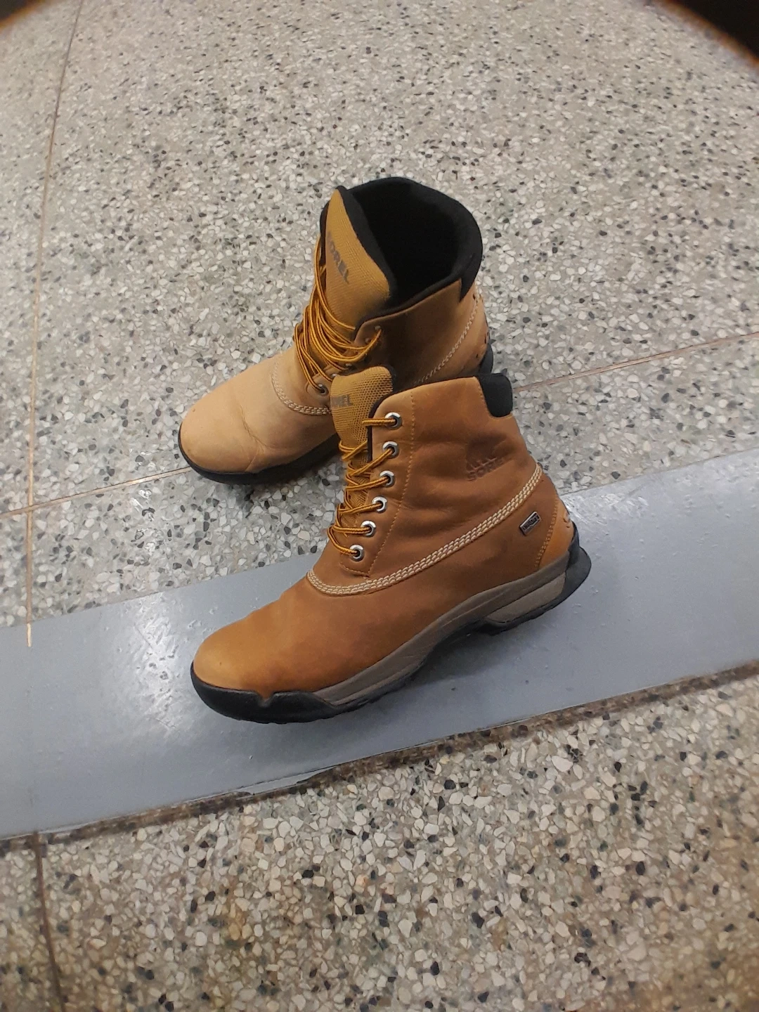 Sorel waterproof boots in a tan colour. Lace-up closure. Rugged soles for good grip. These boots are built to last! Men's size 12.