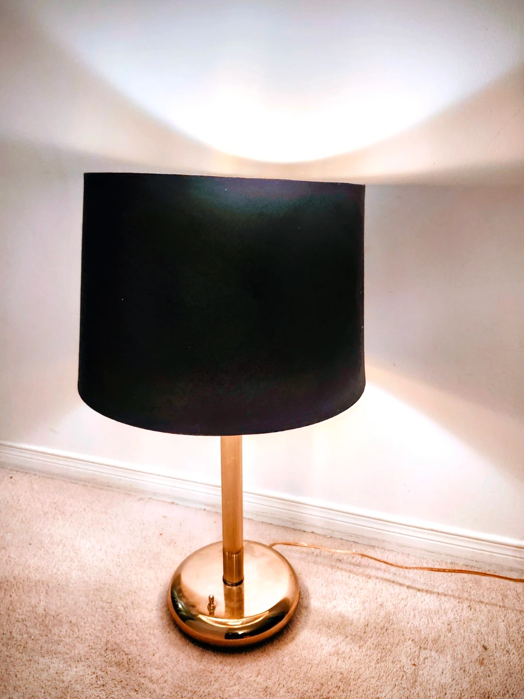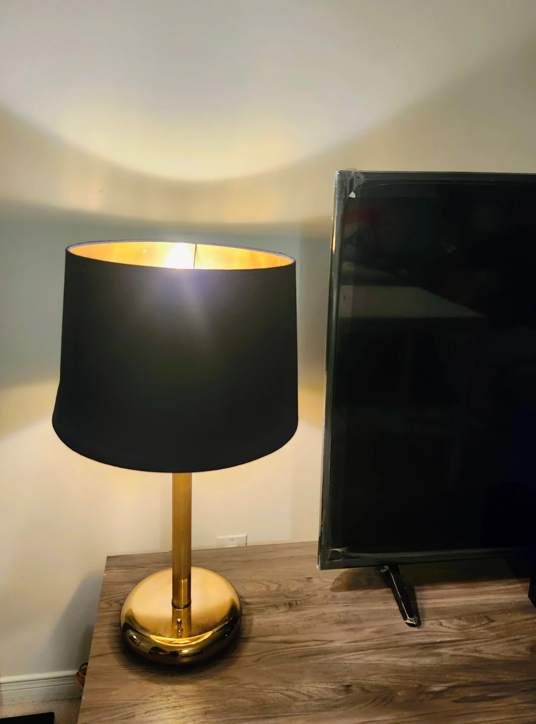 Selling a lovely accent table lamp with a black shade and gold base. It gives off a nice warm light and would look great in any room