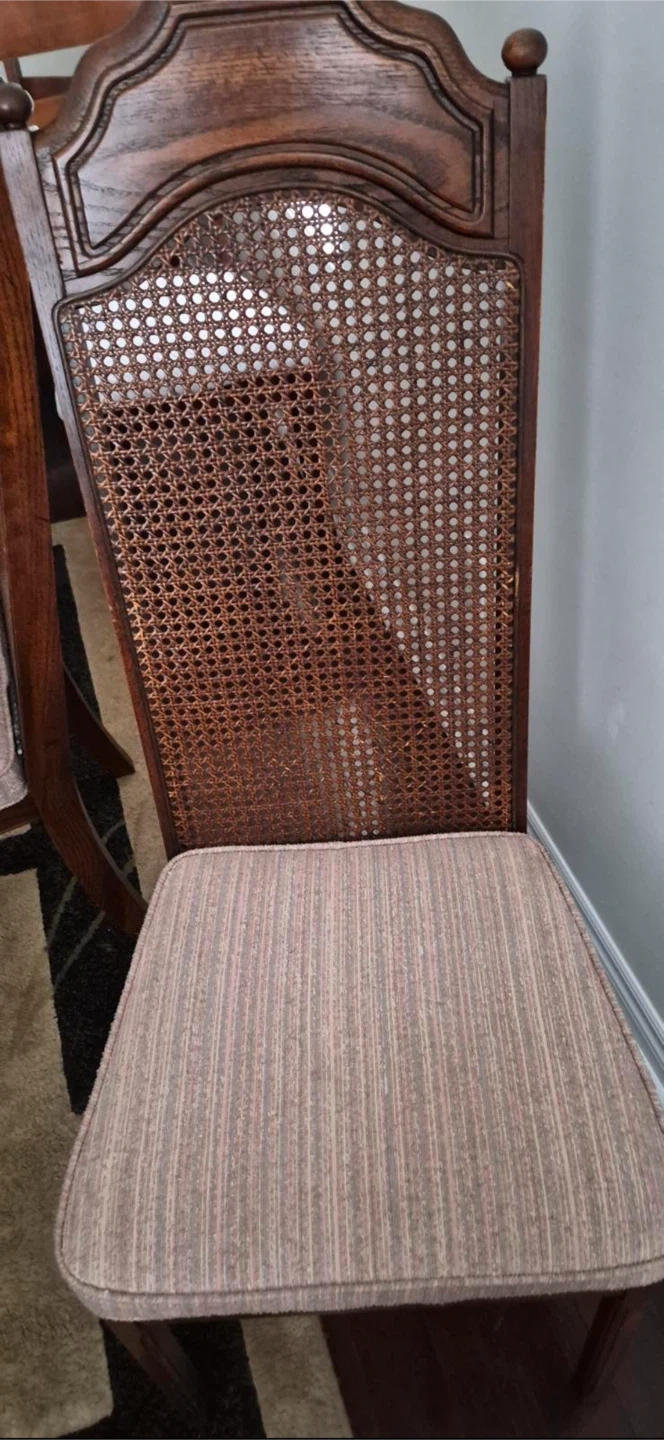A handsome wood dining room set featuring a cane back and upholstered seats. It has elegant detailing and would complement a traditional dining set. Its sturdy construction ensures lasting use. Comes with the table and 2 leaves, 6 chairs, hutch and buffet server. Excellent condition. Moving sale. Make an offer.