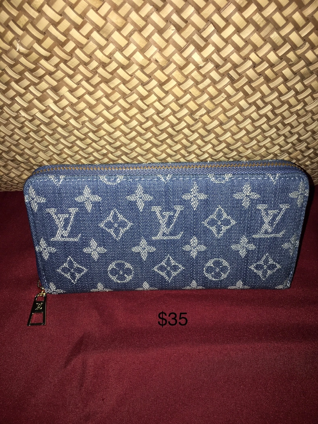 Louis Vuitton zipped wallet in blue denim with signature monogram pattern. Includes original Louis Vuitton box. A stylish accessory for everyday use!