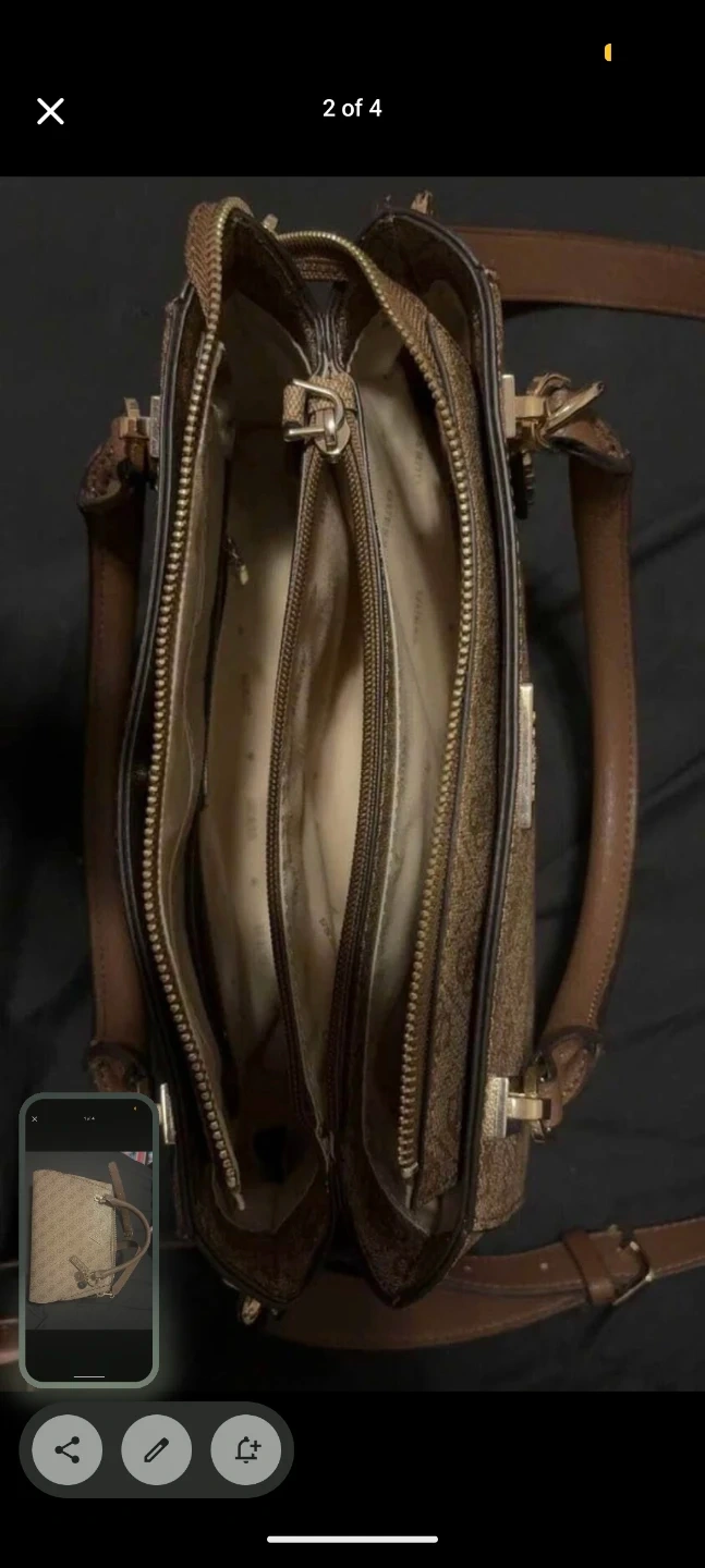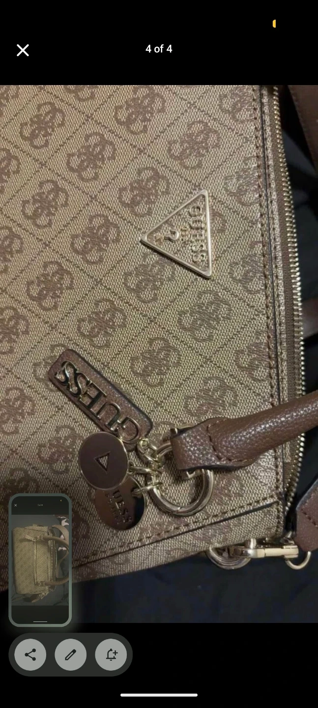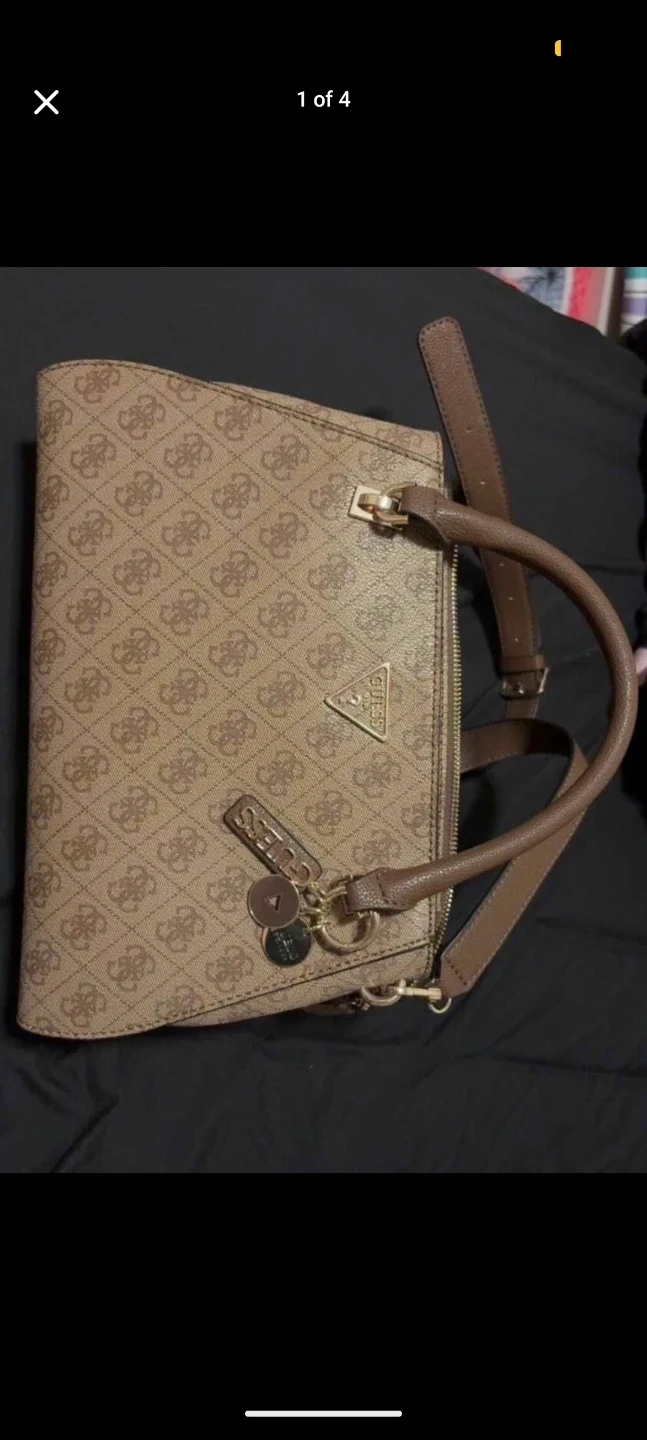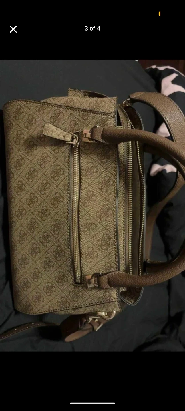 This is a brown Guess satchel handbag with the signature "G" all-over print. It features multiple compartments and zipper closures. Comes with top handles and a detachable shoulder strap.
