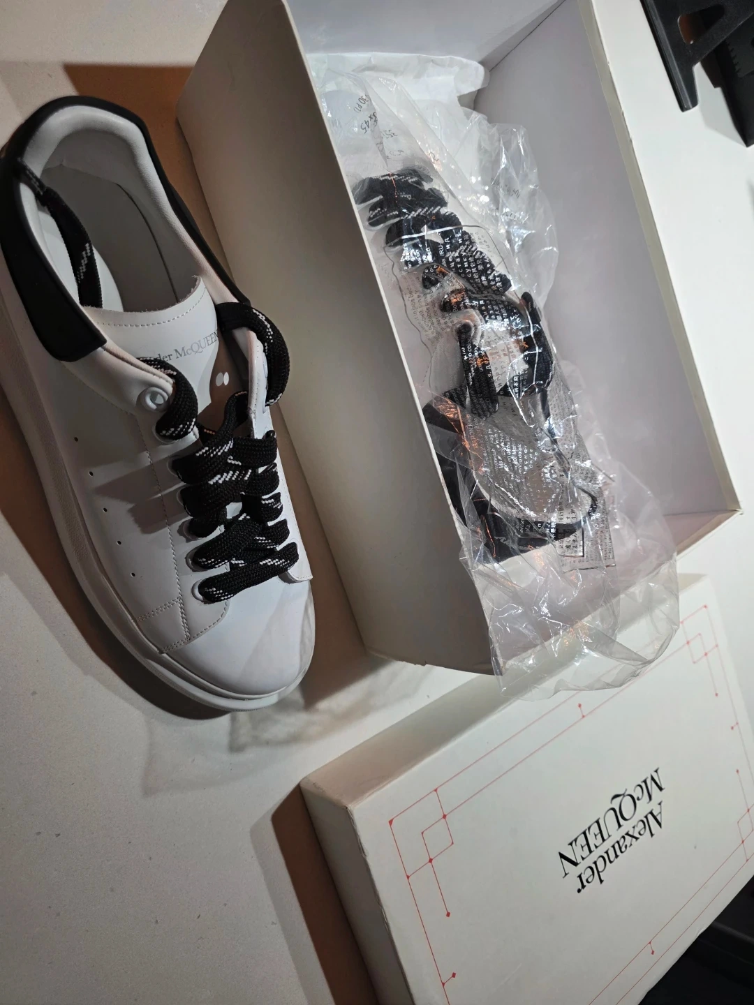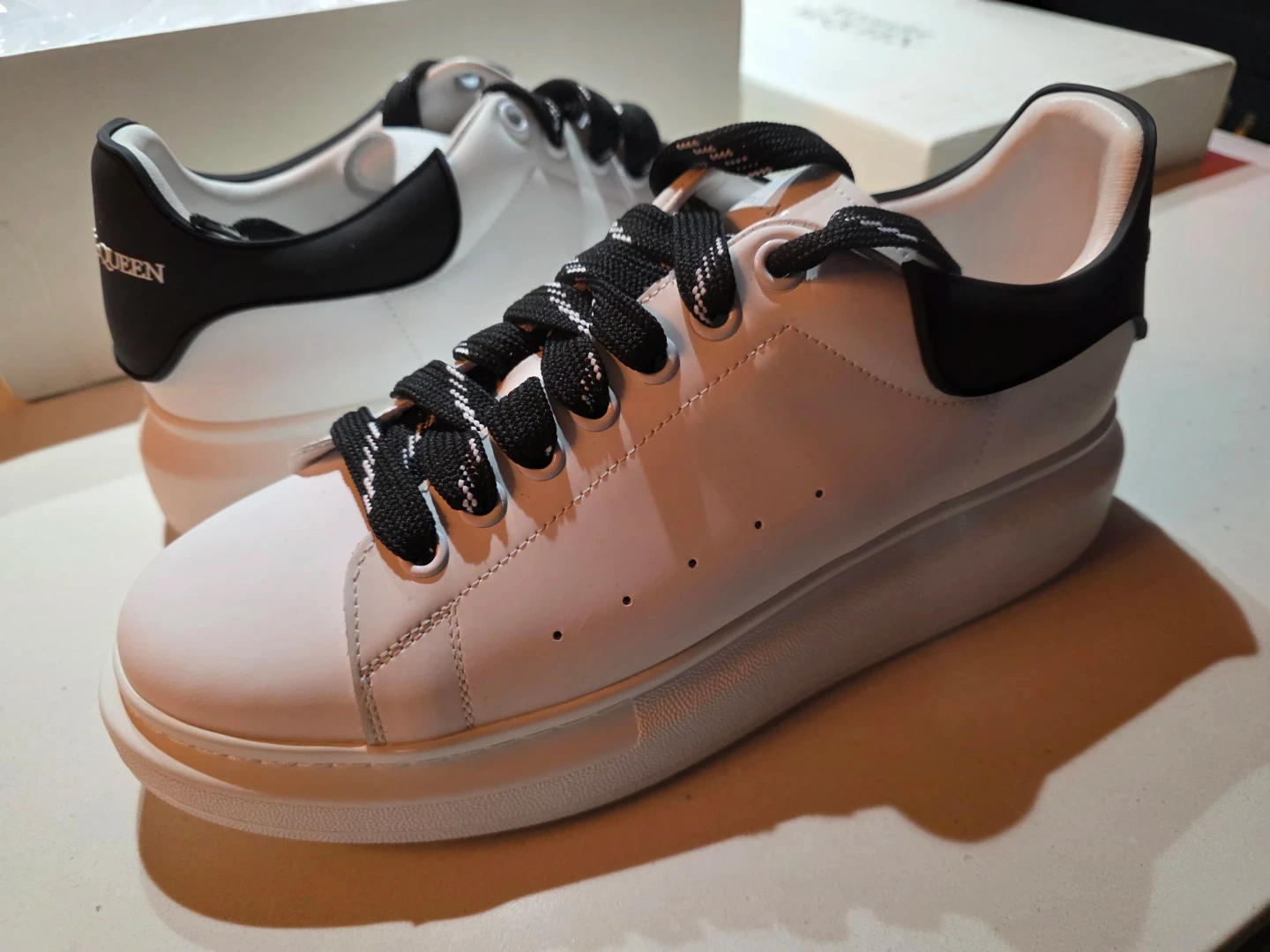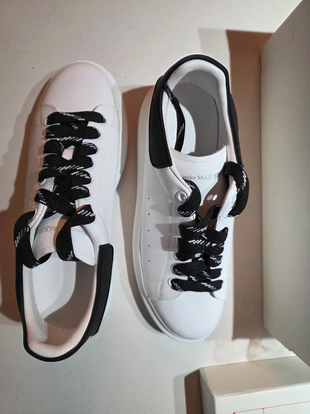 Classic Alexander McQueen oversized sneakers in white leather with black accents. These sneakers feature a distinctive chunky sole and come with extra black laces. Original box and shoe bag included.