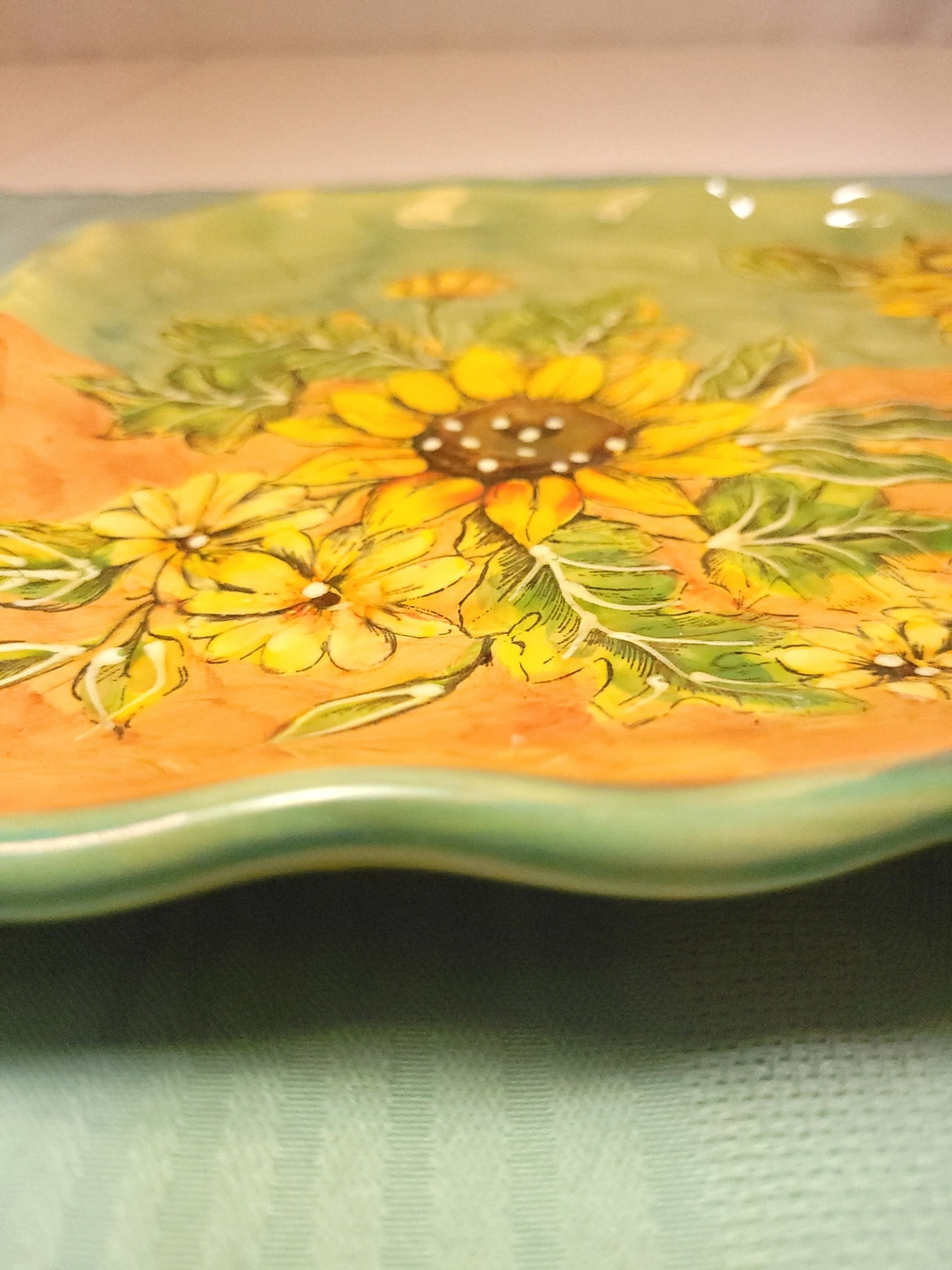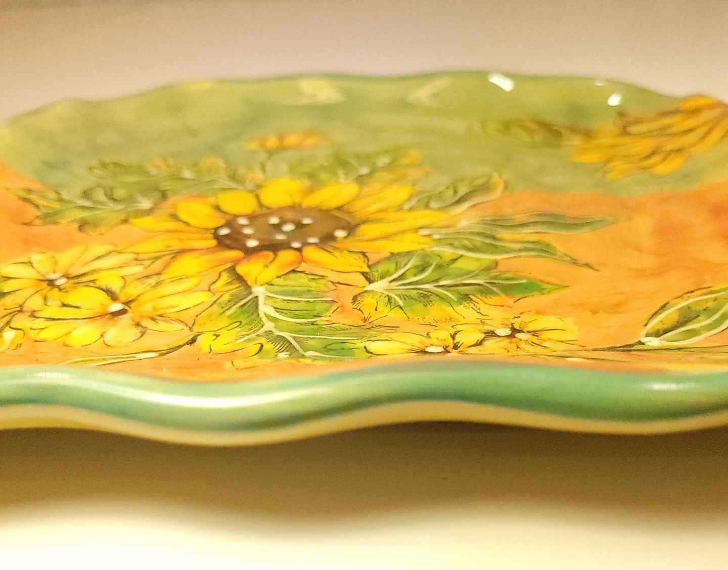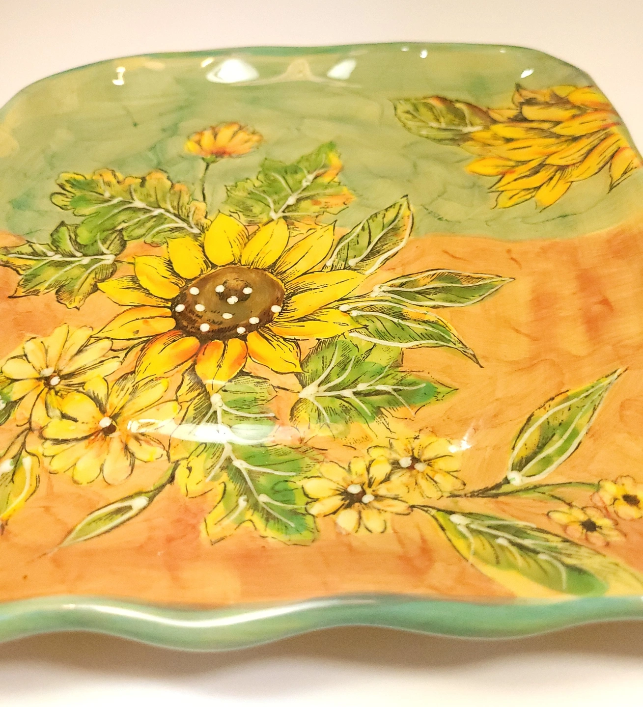 A beautiful piece of early 2000s home decor history, this hand-painted ceramic square plate features a bold, cheerful sunflower design. Originally sold during the inaugural years of HomeSense in Canada, this plate reflects the high-gloss, artisanal "Tuscan" trend that defined the era. The scalloped, wavy rim and rich autumnal tones make it a standout decorative piece for a wall display or a rustic kitchen setting.
