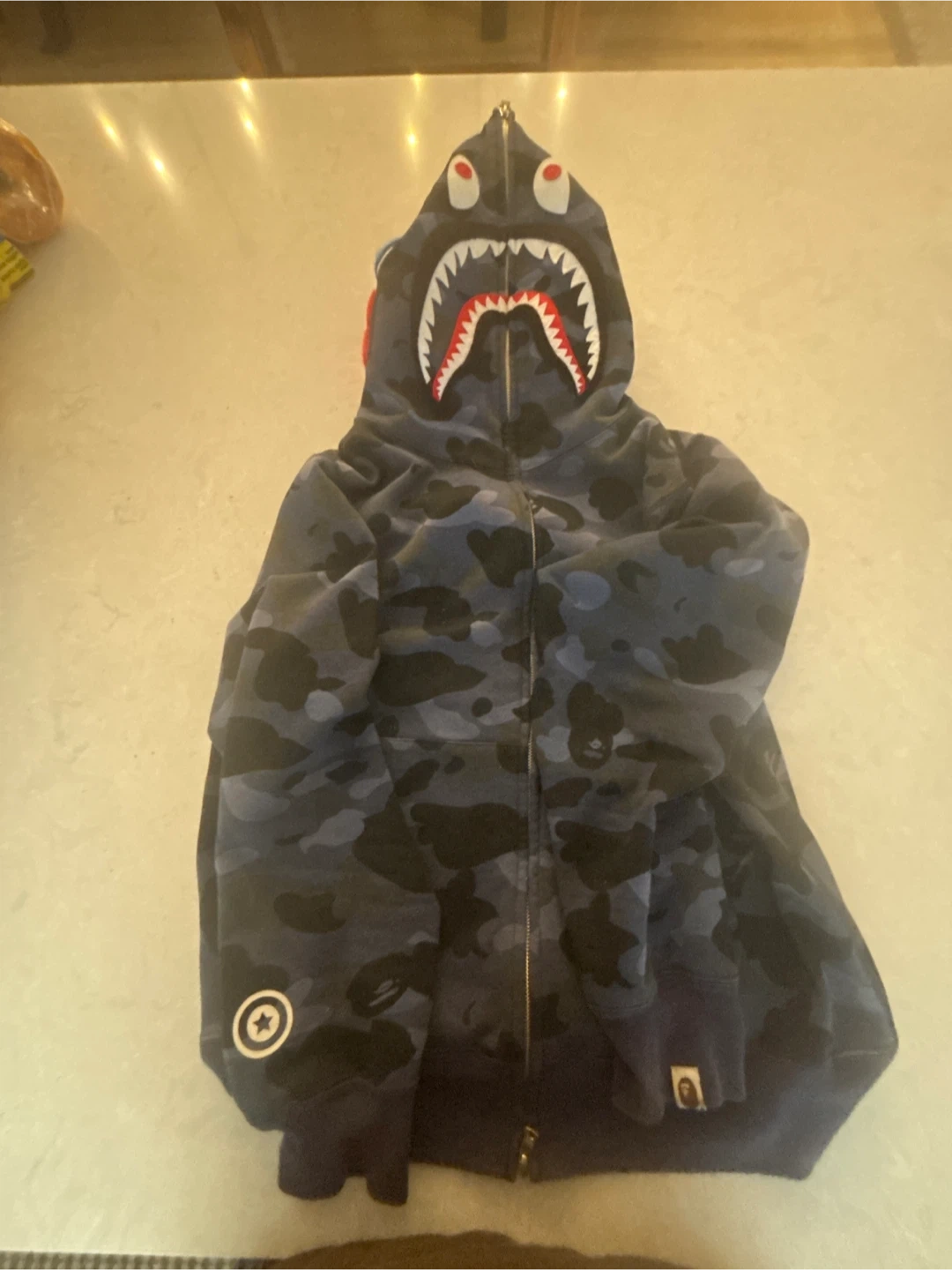 This is a blue camouflage full-zip hoodie from A Bathing Ape. It features the iconic shark graphic on the hood. Size medium. Cotton material.