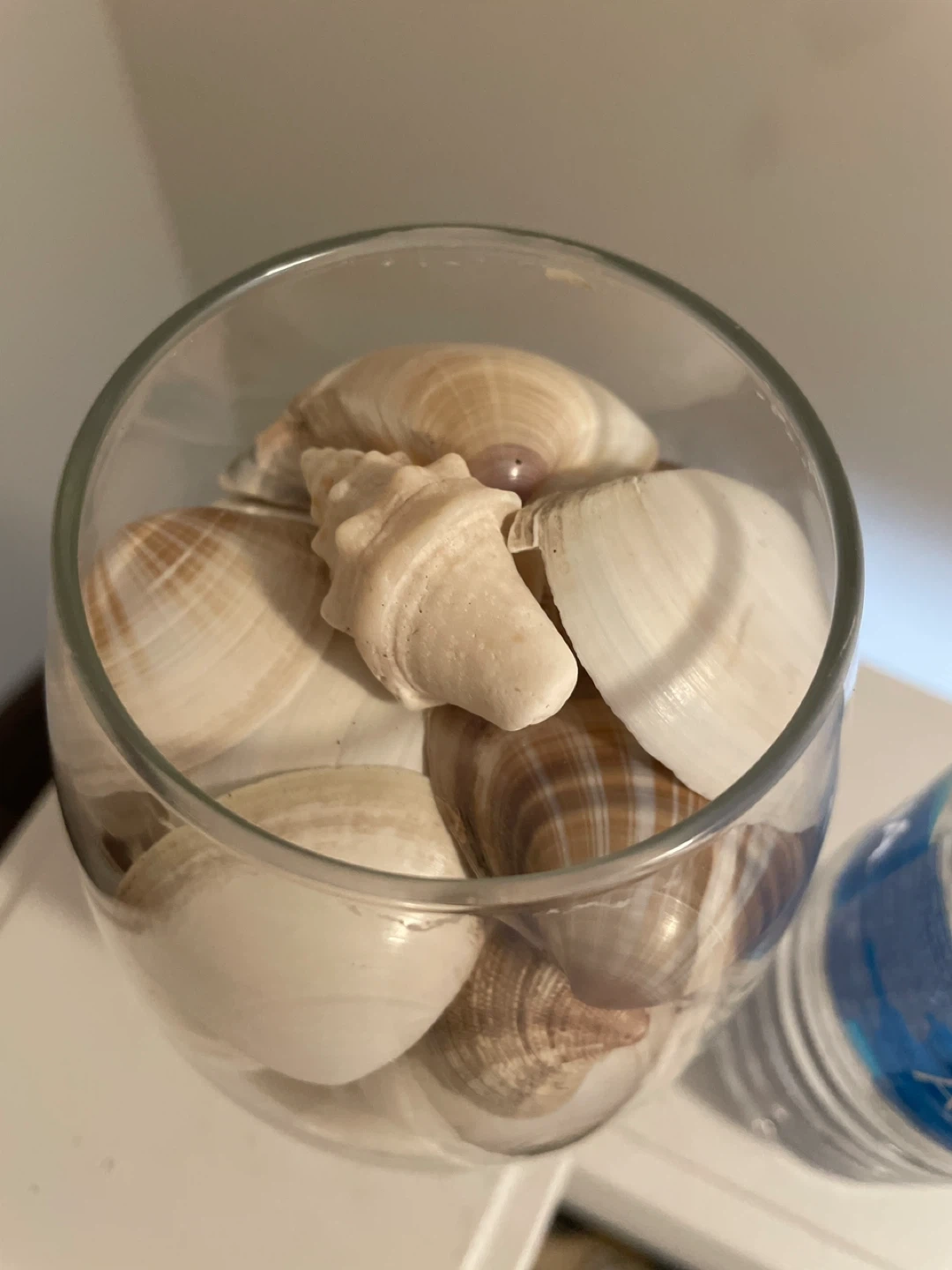 A lovely assortment of natural seashells fills a clear glass vase. Adds a touch of the coast to any room!