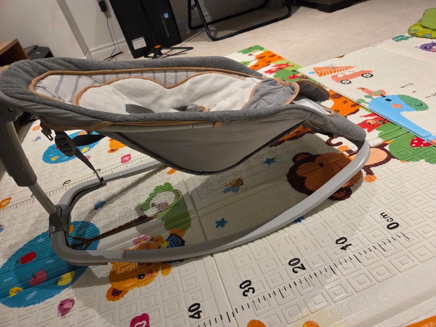 Grey and white striped baby rocker with a soft padded seat and safety straps. It has a metal frame for stability. Perfect for soothing your little one.