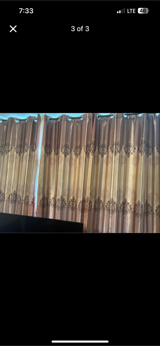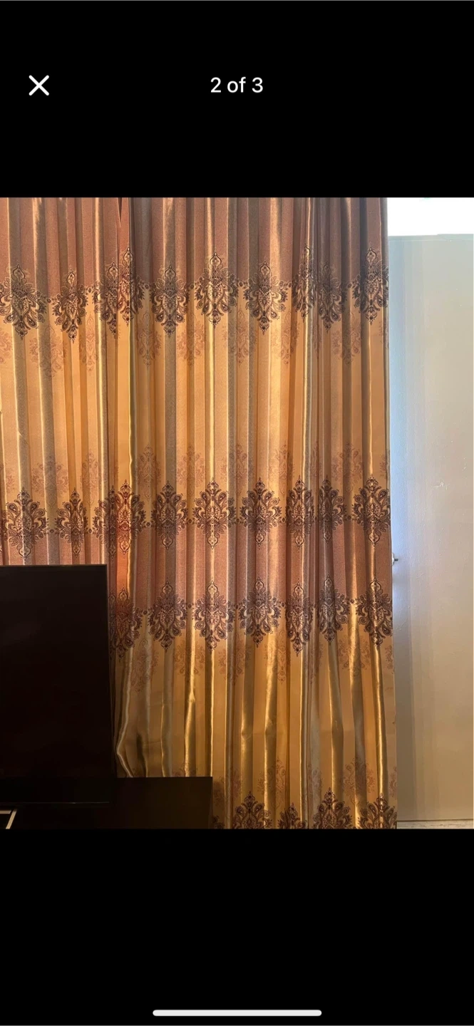 Selling a set of elegant curtains with a gold and brown pattern, perfect for adding a touch of sophistication to any room. They're in great condition and ready to hang in your home.