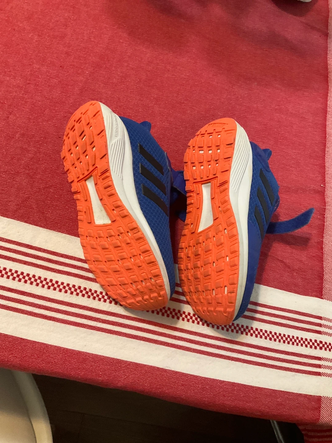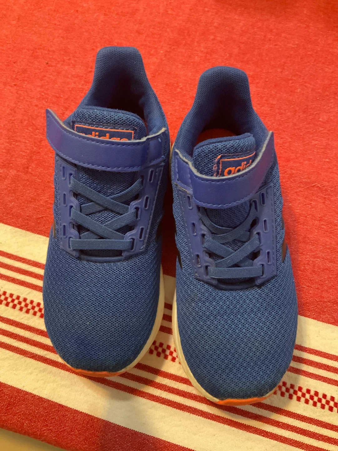Blue Adidas running shoes for kids. They have velcro and lace closures for a secure fit. Great for everyday wear or sports! Size 11