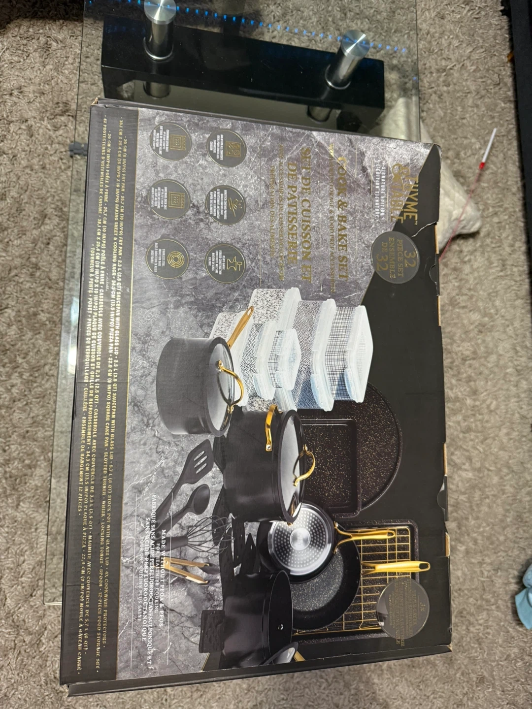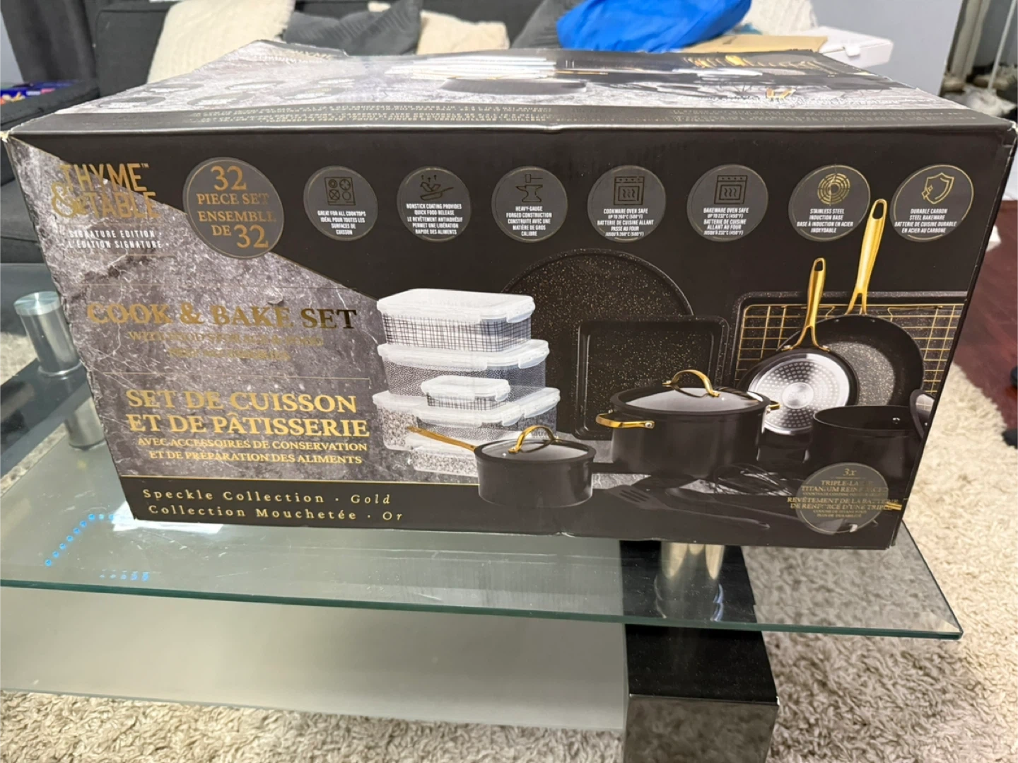 This is a 32-piece cook and bake set from Thyme & Table. It's part of the Speckle Collection in Gold. The set includes pots, pans, and baking sheets.