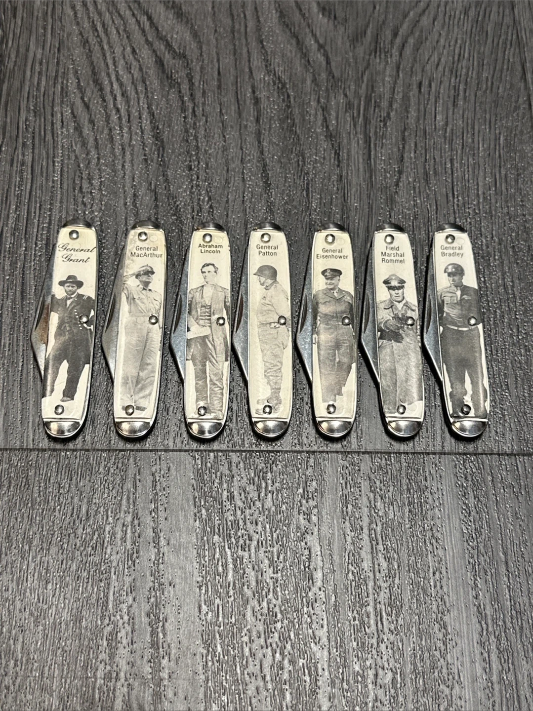 This set includes seven collectible pocket knives, each featuring an image and name of a historical military or political figure. Figures depicted include General Grant, General MacArthur, Abraham Lincoln, General Patton, General Eisenhower, Field Marshal Rommel, and General Bradley. These knives are made with metal blades and decorative handles. The set is for sale for $195, please feel free to send offer and I will consider interesting trades.