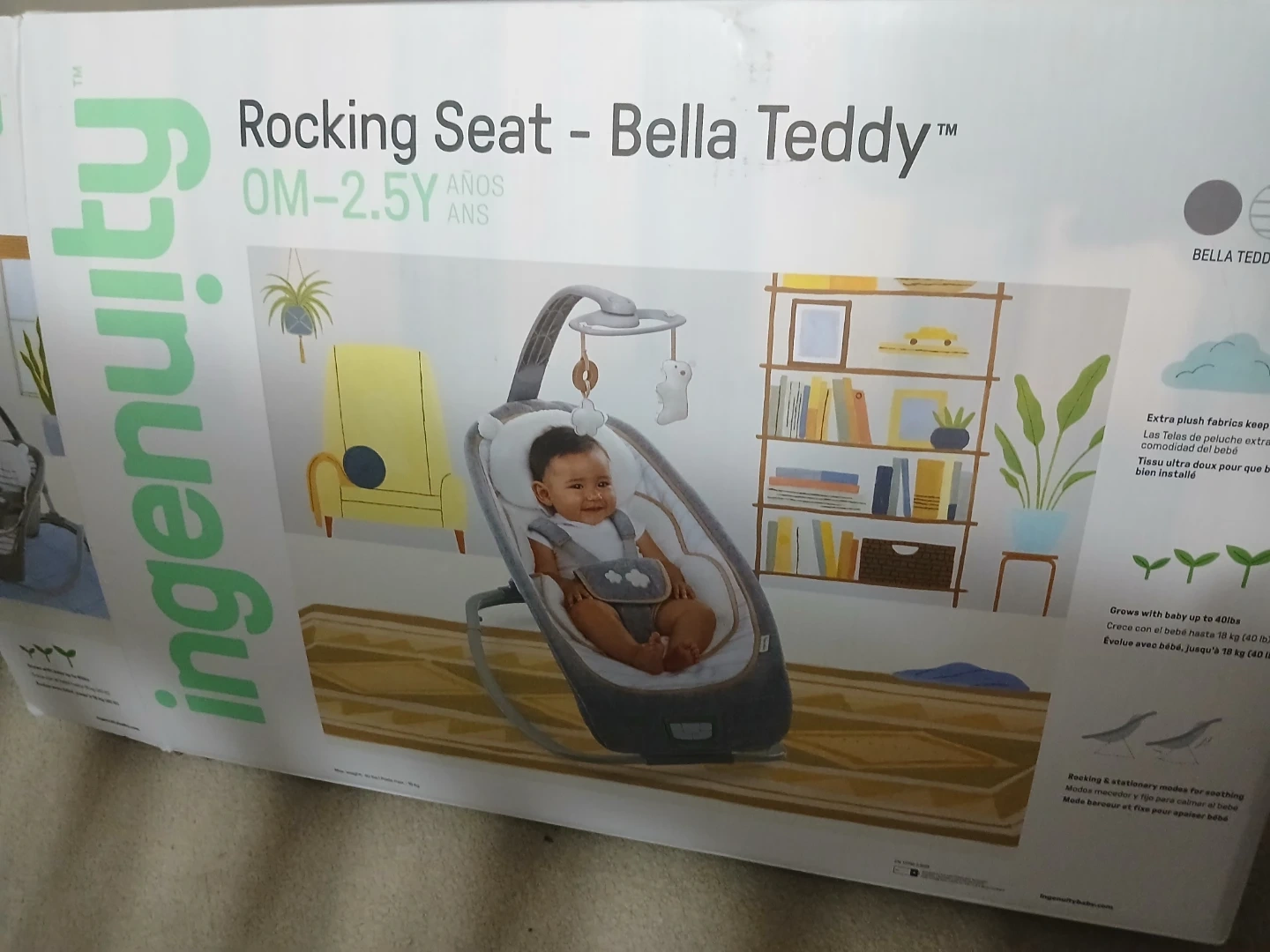 This Ingenuity rocking seat is designed for babies from 0-2.5 years. It features extra plush fabric for comfort and rocking & stationary modes for soothing. Grows with baby up to 40 lbs. Was bought during the Christmas season and used just twice. Comes with the original carton and manual. Batteries thrown in with purchase