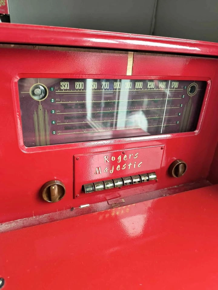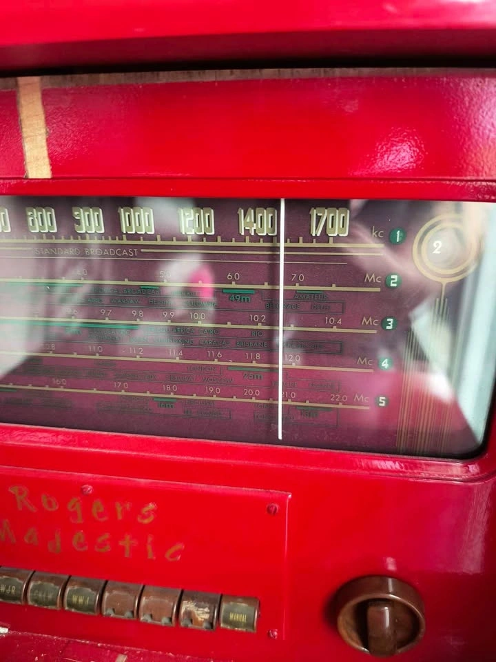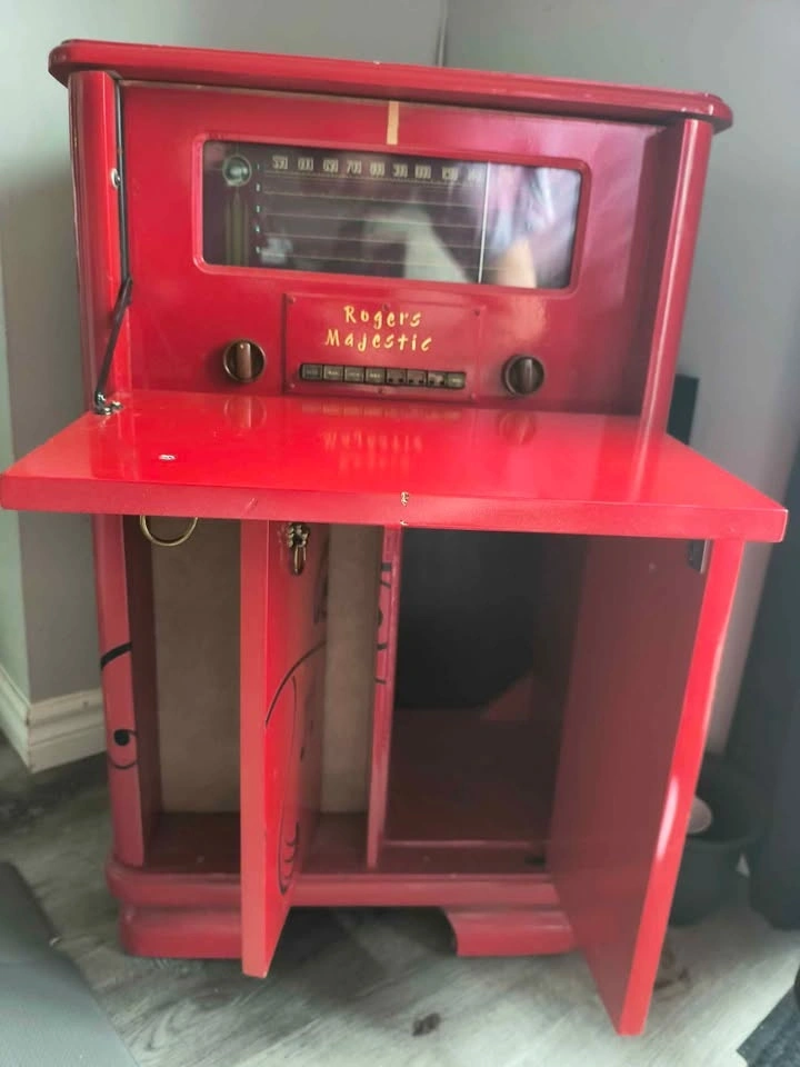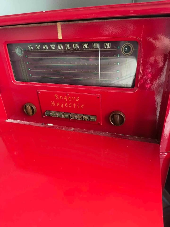 Red Rogers Majestic vintage radio console. Working condition, tubes light up. Plays many stations and the speaker is in great condition. Video shows tubes lighting up.