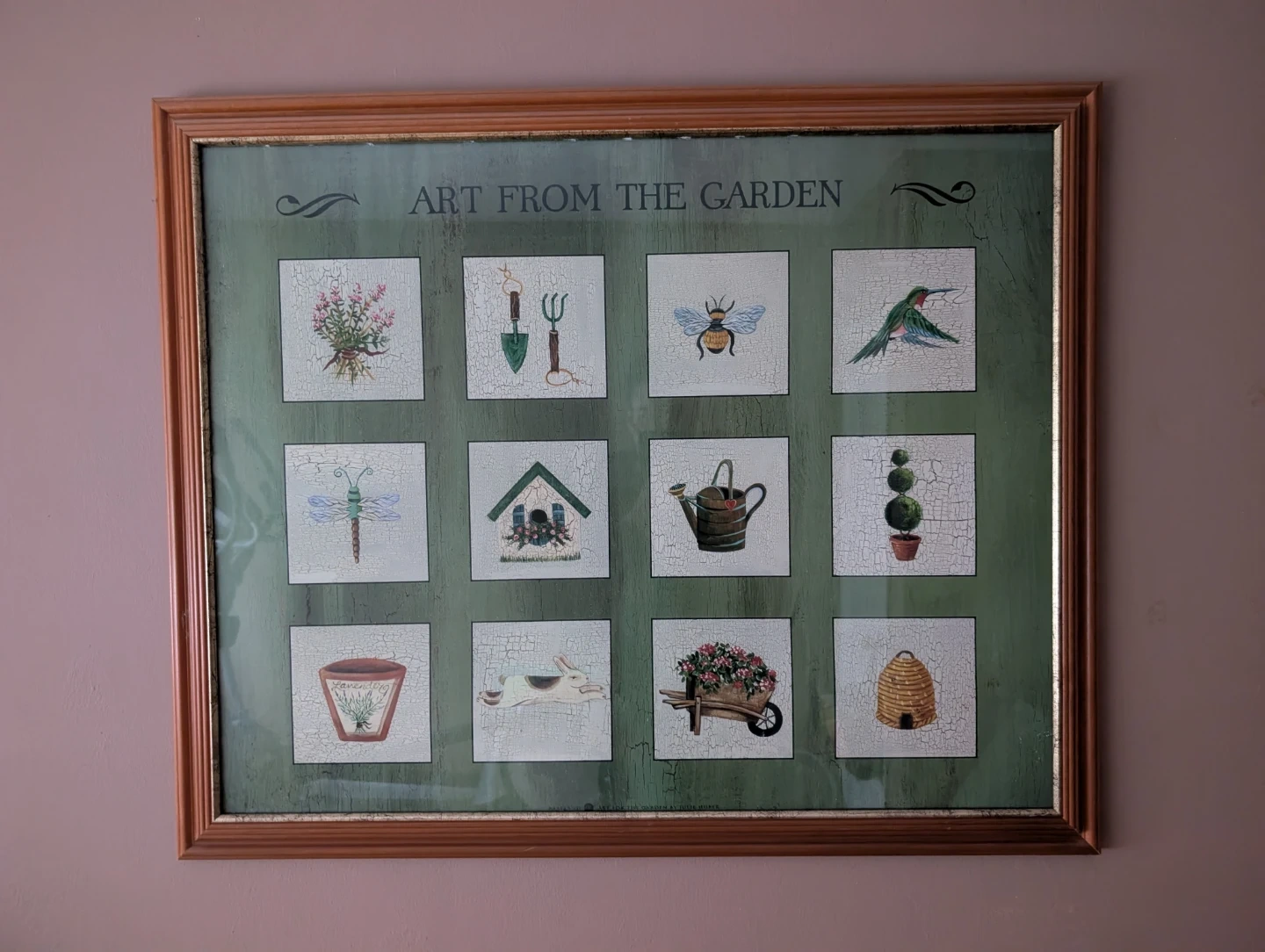Here's a framed print titled 'Art From The Garden'. It features various garden-themed images in a grid layout. The frame is a light brown colour. It's in good condition and ready to hang in your home!
