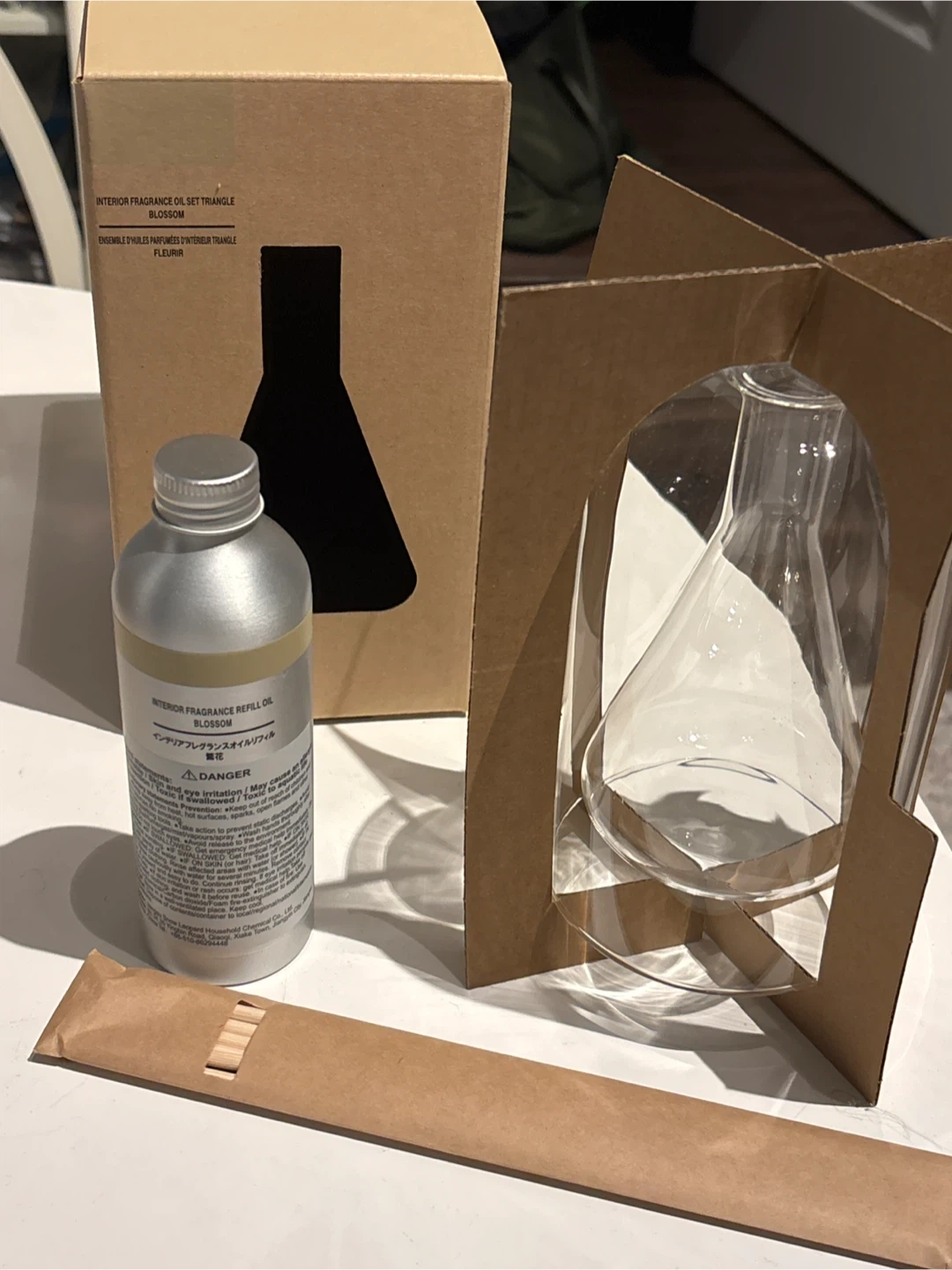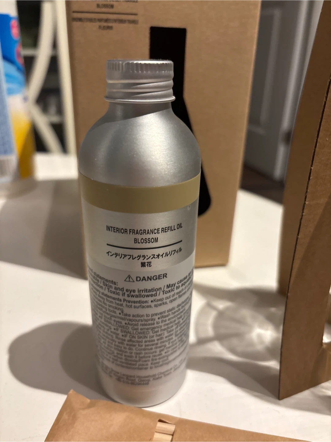 Interior fragrance oil refill with blossom scent. Includes diffuser reeds. Refill bottle is aluminum. Glass diffuser bottle is included. Fill your home with soft floral scent. Brand new, original price $45.