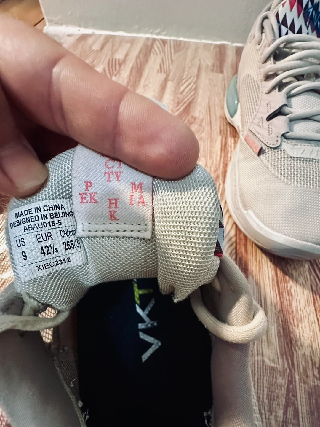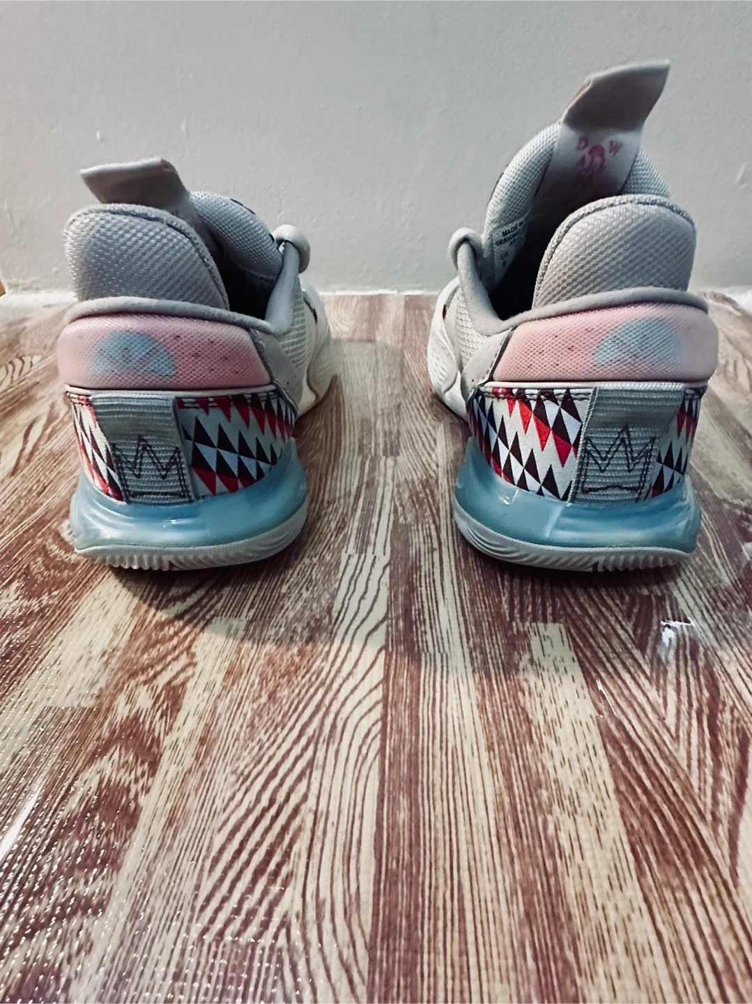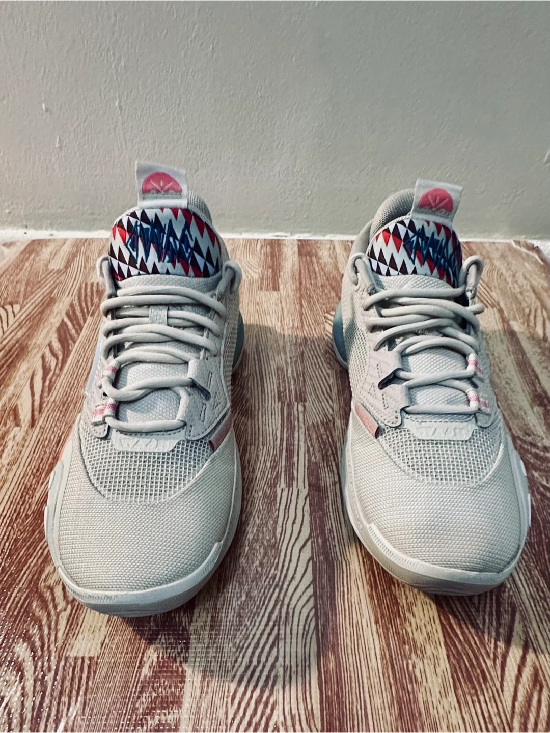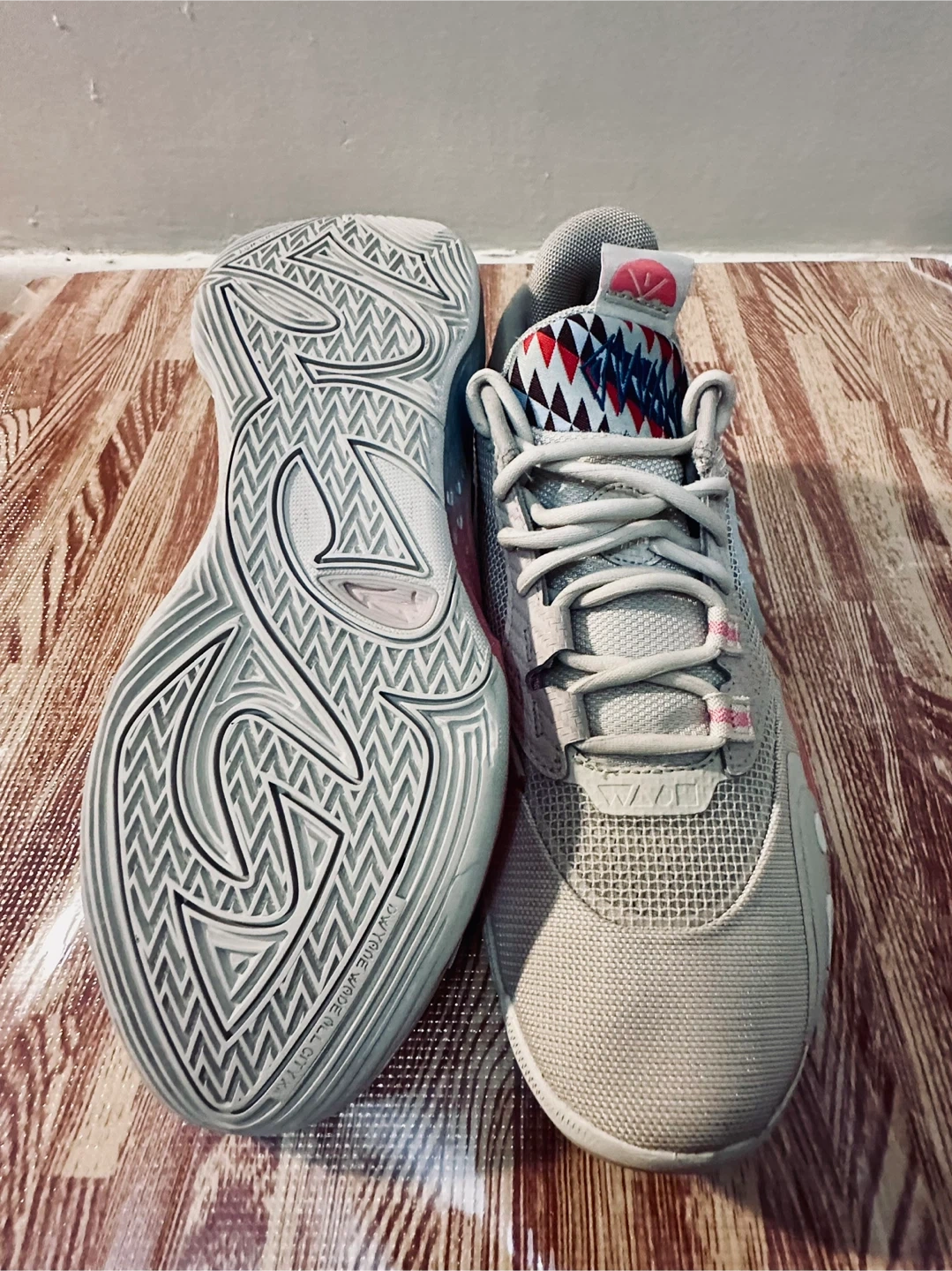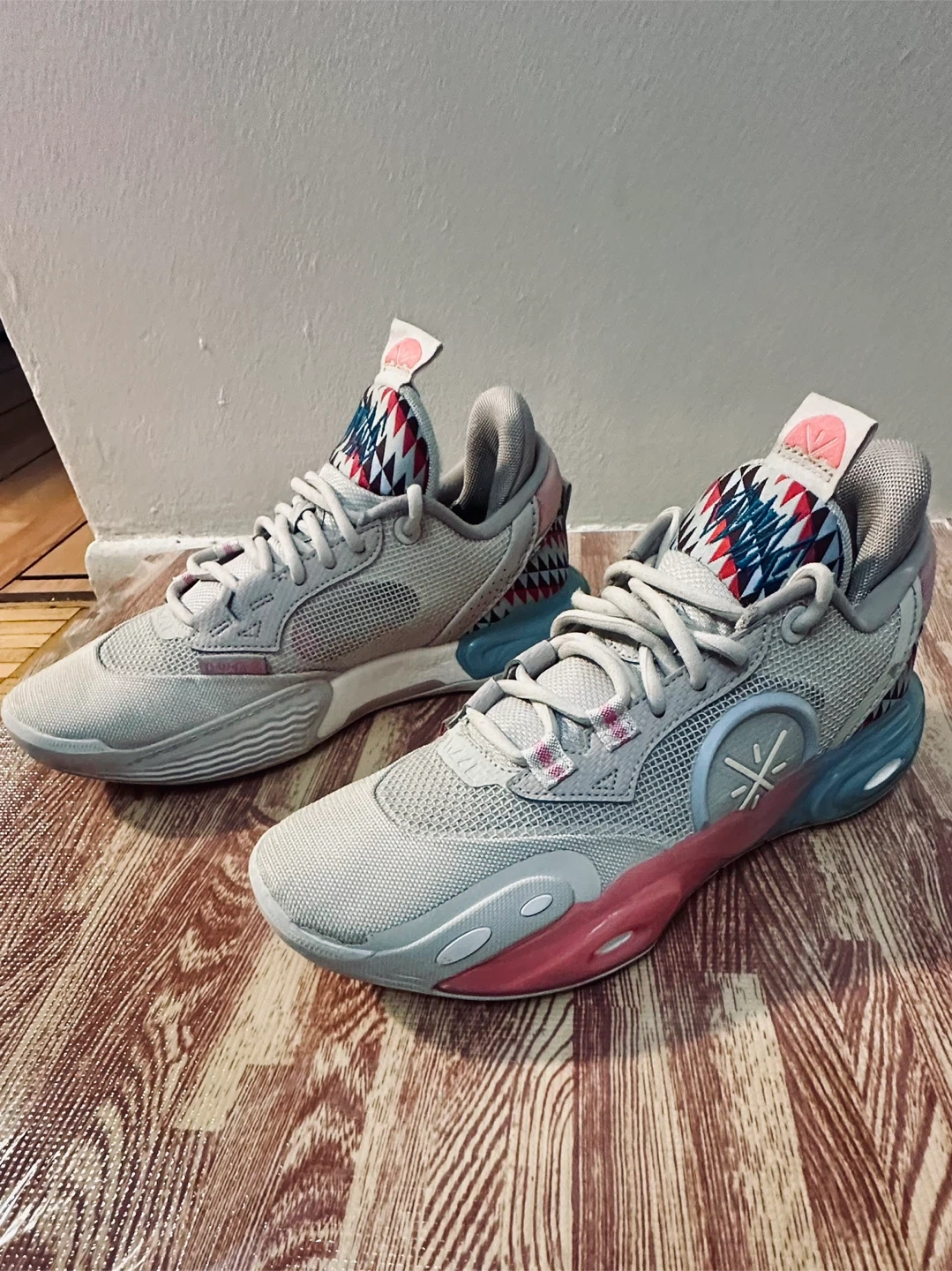 These Li-Ning Way of Wade All City 9 V2 basketball shoes are a size 9. They feature a grey mesh upper with a unique shark-tooth inspired design on the heel and midsole accents in pink and blue. The outsole provides excellent traction.