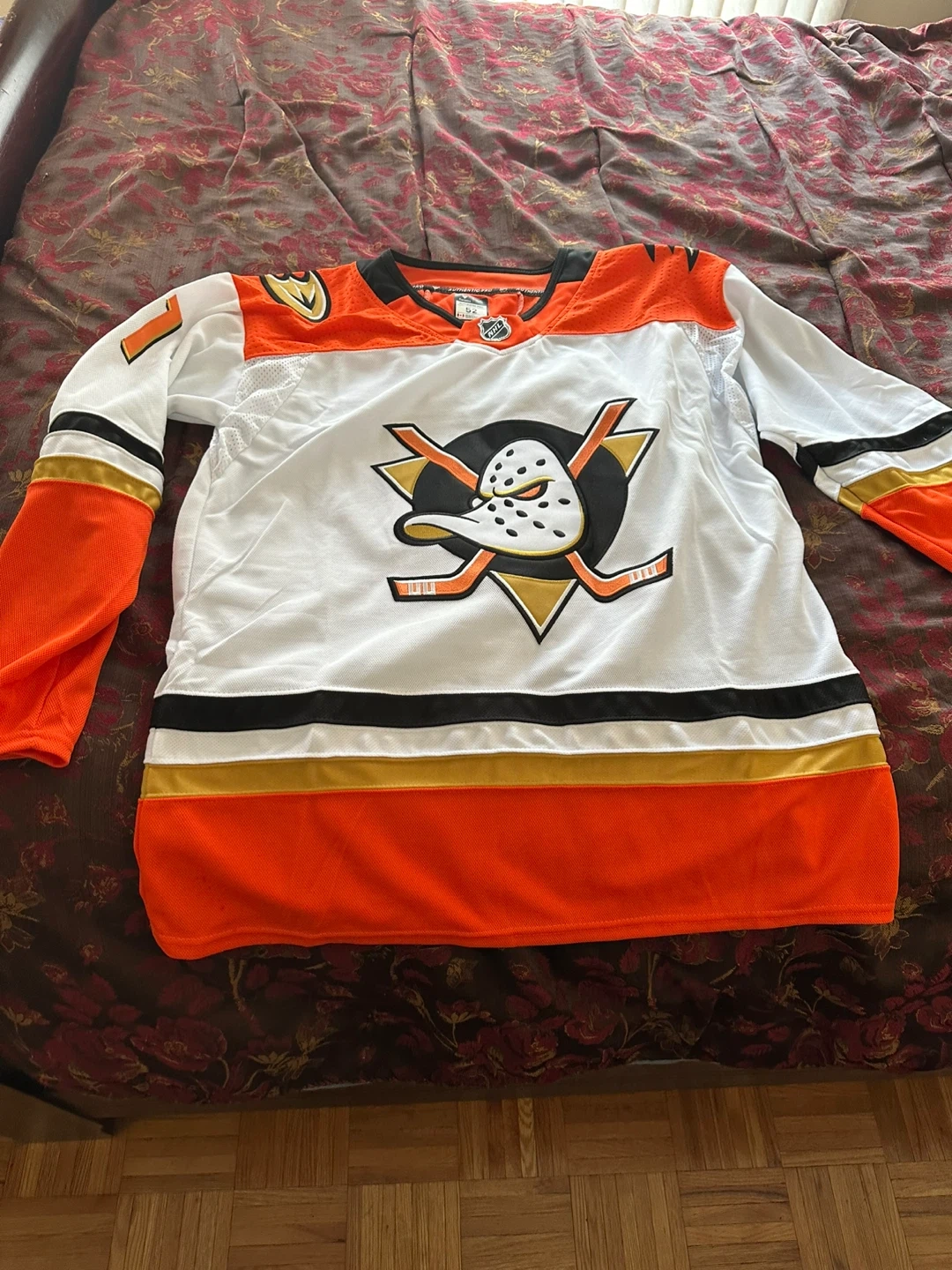 This is a replica hockey jersey for the Anaheim Ducks, featuring "ZEGRAS" and the number "11" on the back. It's the team's white home colourway with orange and black accents. This jersey is great for any Ducks fan!
