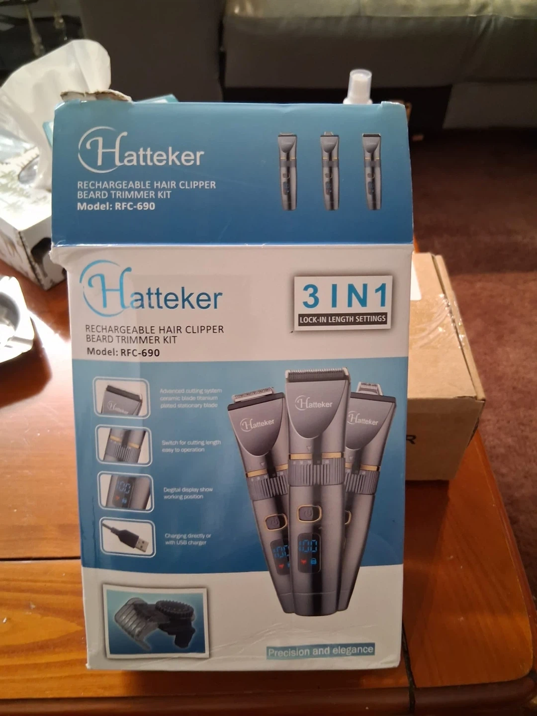 This is the Hatteker Rechargeable Hair Clipper and Beard Trimmer Kit, model RFC-690. It features an advanced cutting system with a ceramic blade and titanium plated stationary blade. The digital display shows the working position, and it charges directly with a USB charger. This kit has 3-in-1 lock-in length settings for easy operation.