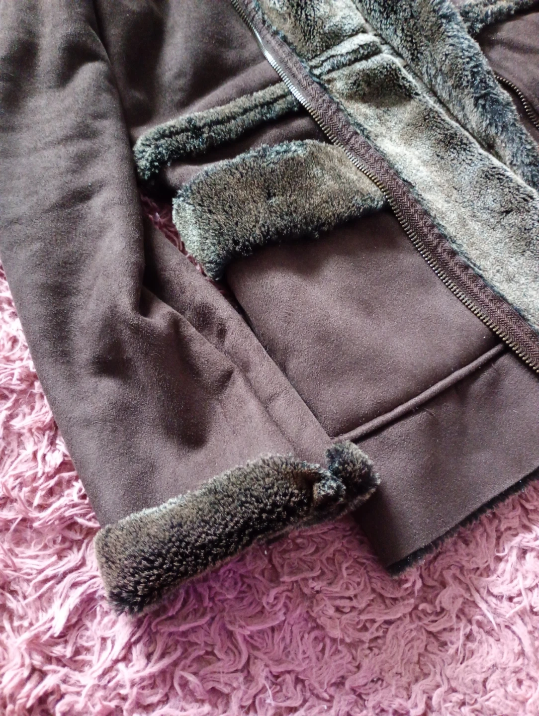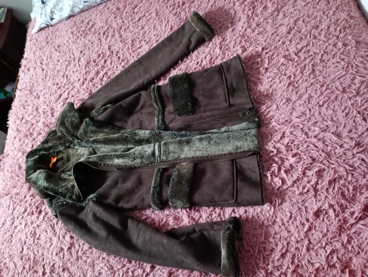 Cozy brown jacket with faux fur lining and trim. It features a zip-up front and two front pockets. Used only a couple of times. Size M